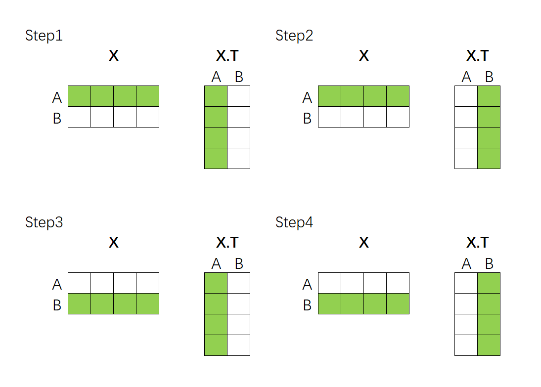 这个过程可以通过矩阵的乘法来完成。假设现在我们的向量中有2个样本(A与B),每个样本被编码为了拥有4个特征的词向量。如下所示,如果我们要计算A、B两个向量之间的相关性,只需要让特征矩阵与其转置矩阵做点积就可以了------