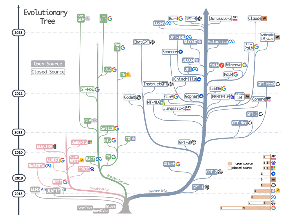 学习Transformer并不只是学习一个算法,而是学习以Transformer为核心的一整个、基于注意力机制的大体系。在NLP领域中,有这样一张著名的树状图,它展示了从2018年到2023年的各种基于Transformer架构的语言模型的发展历程,并将模型从"开源/闭源"、"encoder/decoder/encoder-decoder"以及开发公司三个维度进行了划分。这个演化树很好地概述了从2018年到2023年基于Transformer架构的模型的发展脉络,让我们一步步来解读这个发展历史。