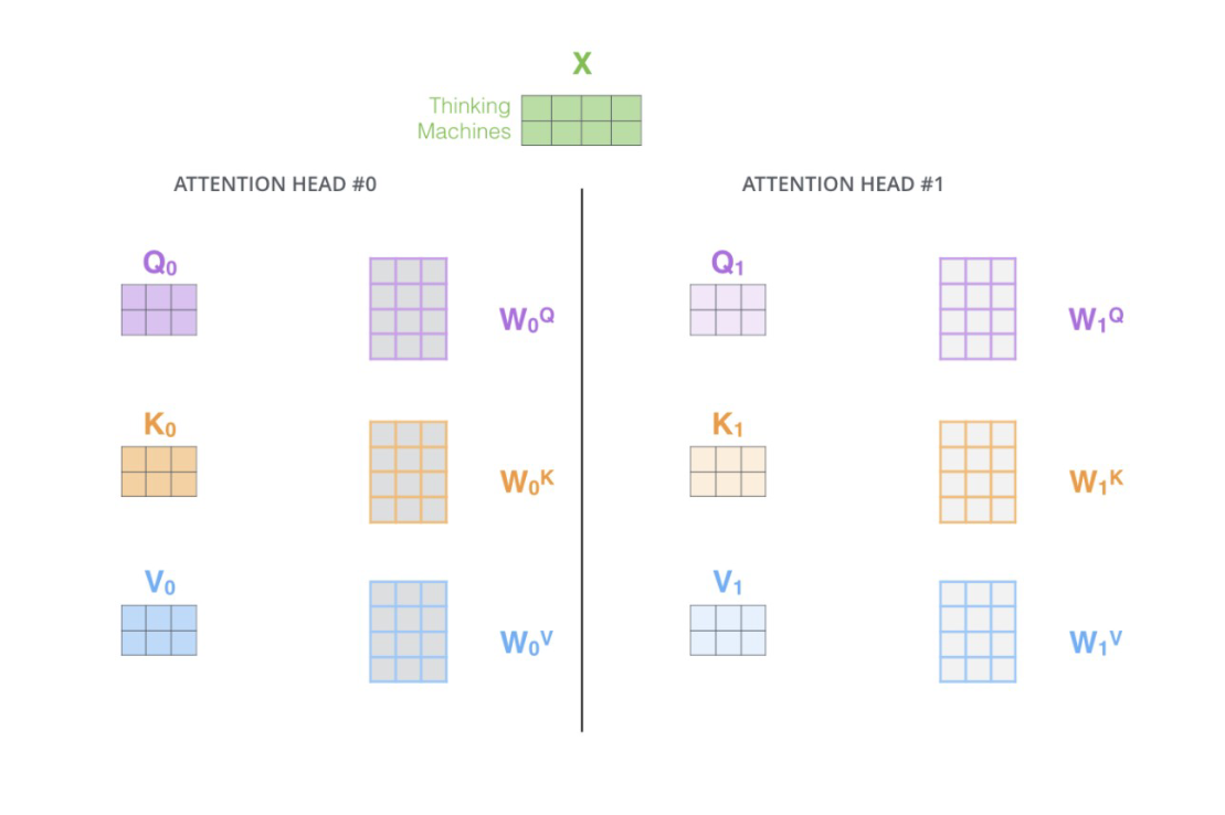 Multi-Head Attention 就是在 Self-Attention 的基础上,对于输入的 embedding 矩阵, Self-Attention 只使用了一组WQ,WK,WVW^Q,W^K,W^VWQ,WK,WV 来进行变换得到Query,Keys,Values。而Multi-Head Attention使用多组WQ,WK,WVW^Q,W^K,W^VWQ,WK,WV 得到多组Query,Keys,Values,然后每组分别计算得到一个Z矩阵,最后将得到的多个Z矩阵进行拼接。Transformer原论文里面是使用了8组不同的WQ,WK,WVW^Q,W^K,W^VWQ,WK,WV 。