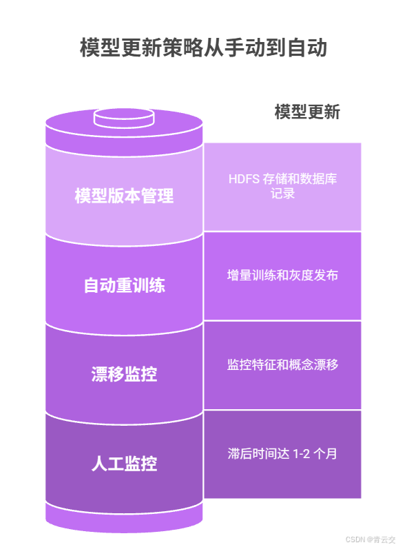- 人工更新滞后:传统人工监控 + 重训练,滞后时间达 1-2 个月,导致模型效果衰减。