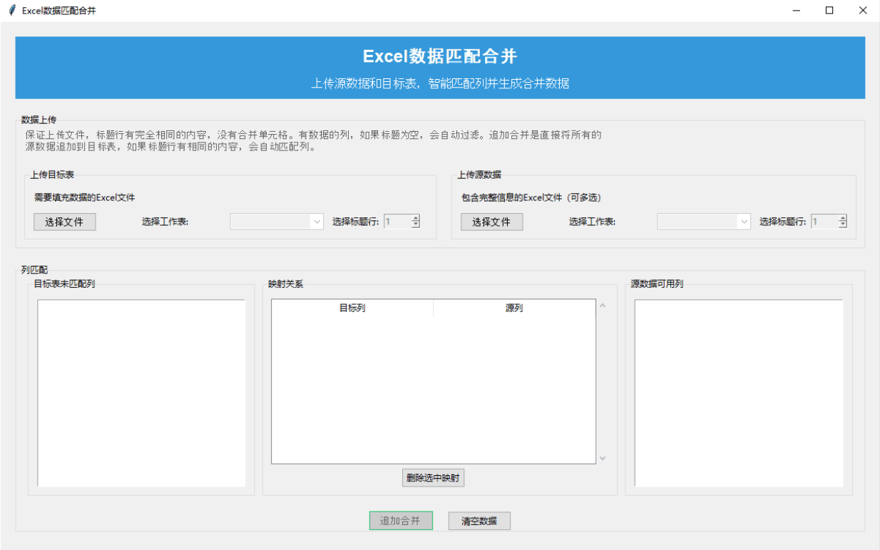 1、多文件上传支持:可以上传一个目标Excel文件和多个源数据文件