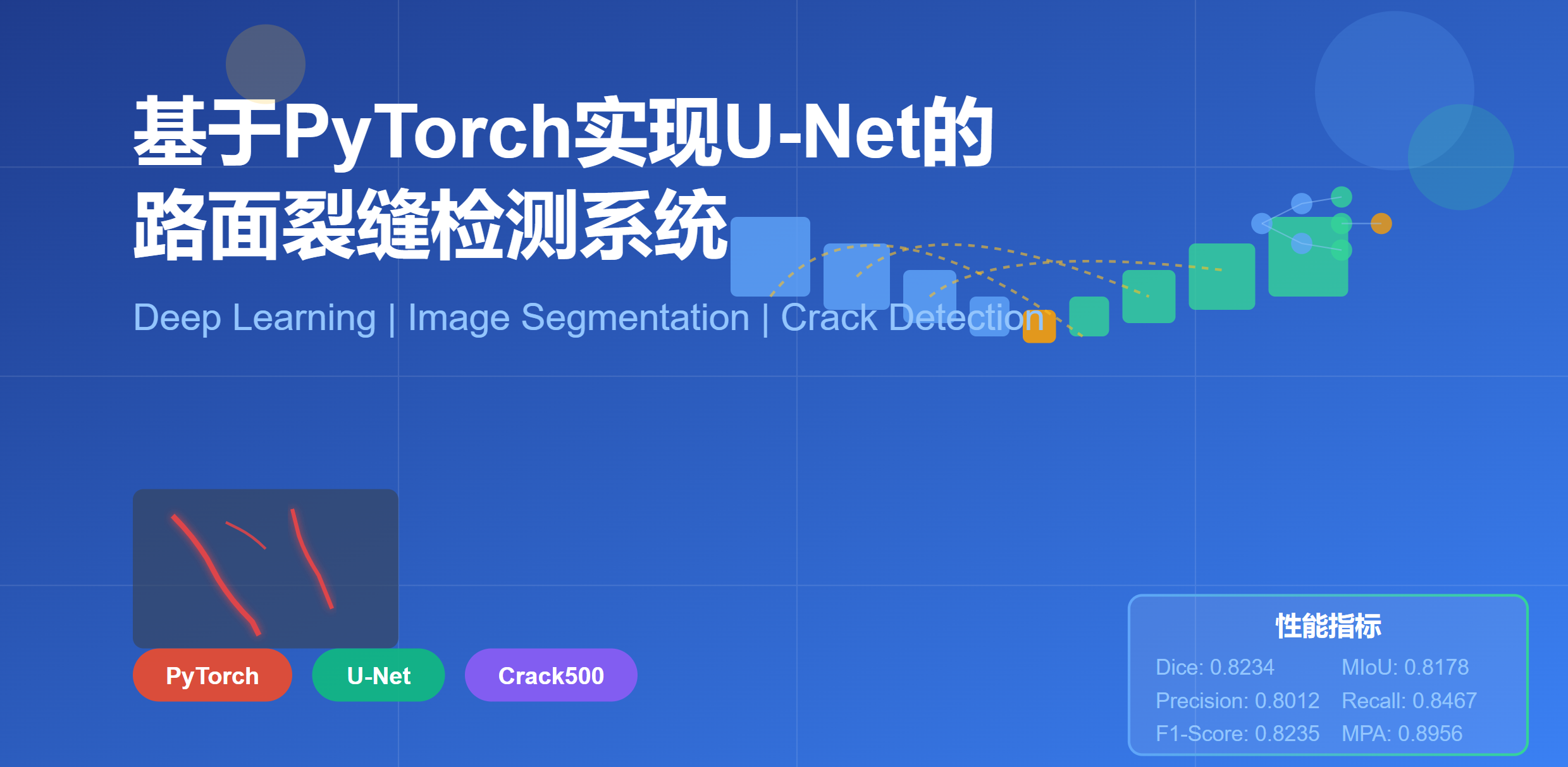 本文详细介绍了如何使用PyTorch框架实现标准U-Net模型,并将其应用于Crack500路面裂缝检测数据集。项目实现了完整的训练流程,包括数据加载、模型构建、训练验证、多指标评估以及结果可视化。最终系统能够自动检测路面图像中的裂缝区域,为道路维护提供技术支持。