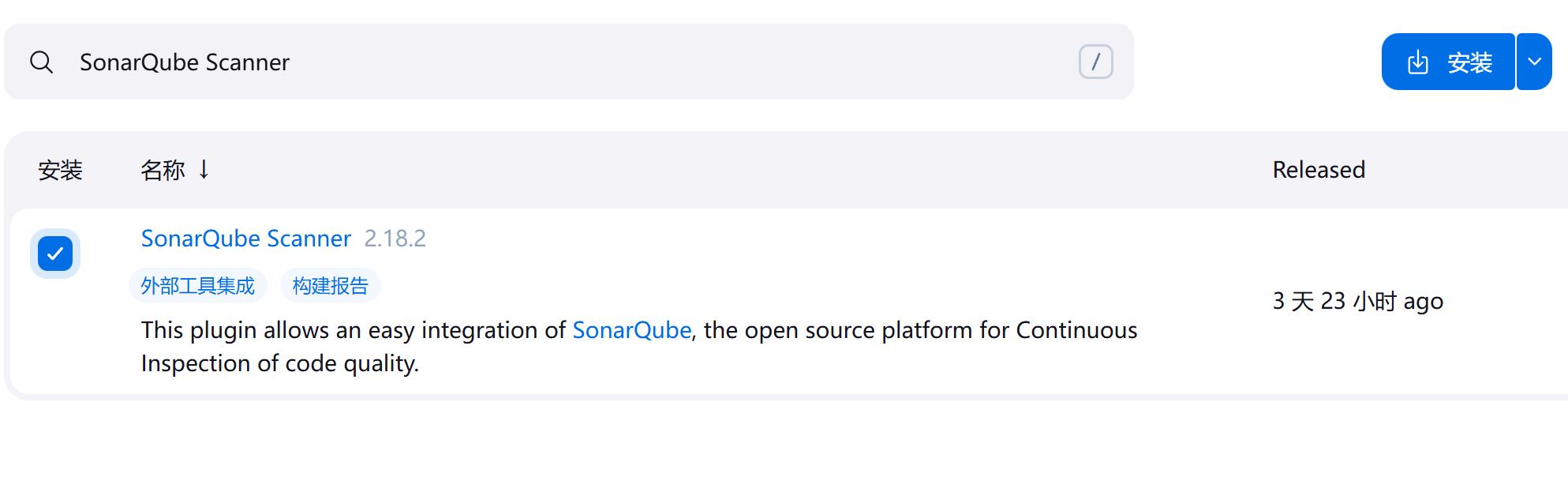 5. 验证插件:安装完成后,进入**Manage Jenkins** → **Plugins** → **Installed plugins** ,搜索 "SonarQube Scanner",确认状态为 "Installed"。