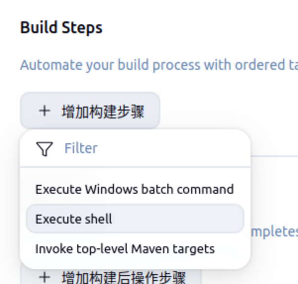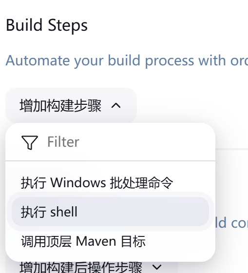 在项目配置页面的 "构建" 部分,先添加一个 "执行shell" 步骤