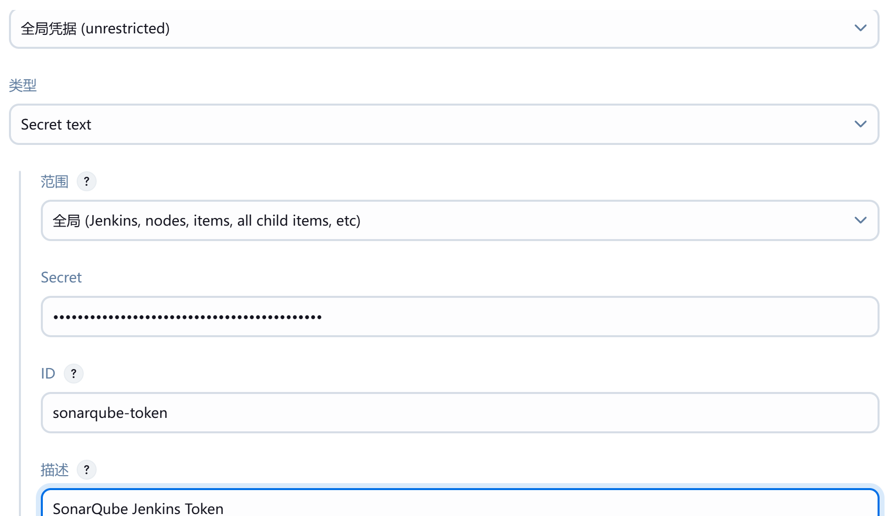 * **Secret**:粘贴步骤四生成的 SonarQube 令牌;