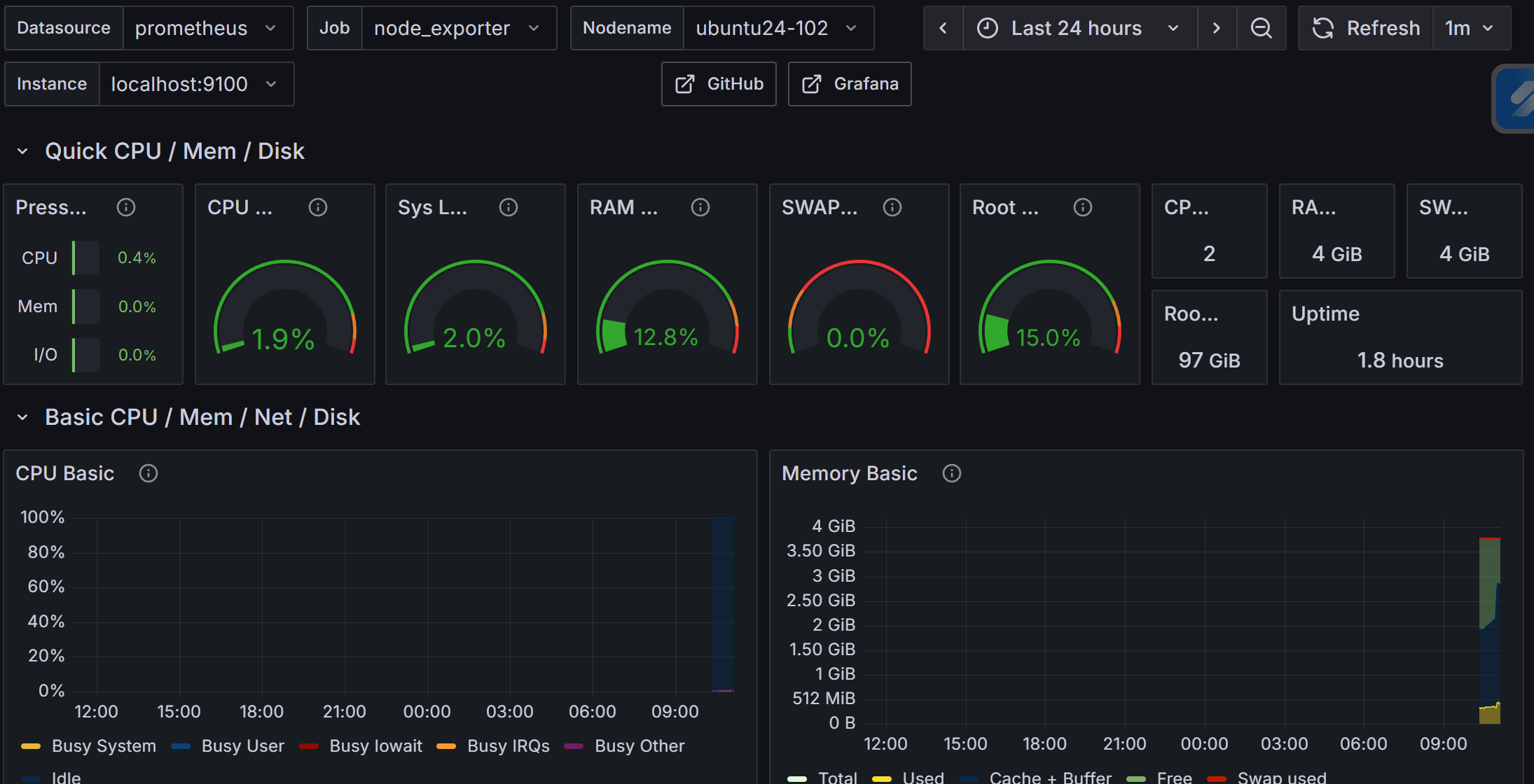 导入完成后,会自动进入 "Node Exporter Full" 仪表板,可看到以下系统指标面板(数据实时更新):