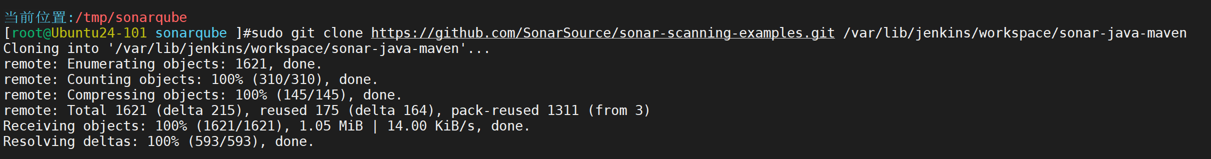# 拉取Maven示例项目到Jenkins工作目录 sudo git clone https://github.com/SonarSource/sonar-scanning-examples.git /var/lib/jenkins/workspace/sonar-java-maven