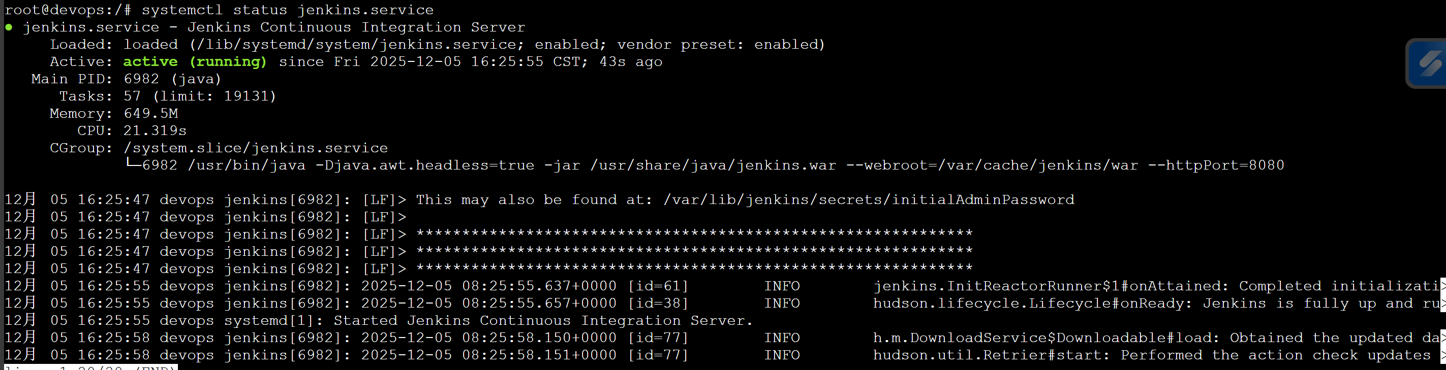 1.在 Linux 系统上安装 Jenkins 2.528.2,并完成基本的初始化配置,包括管理员密码的设置、插件的安装和用户权限的配置。