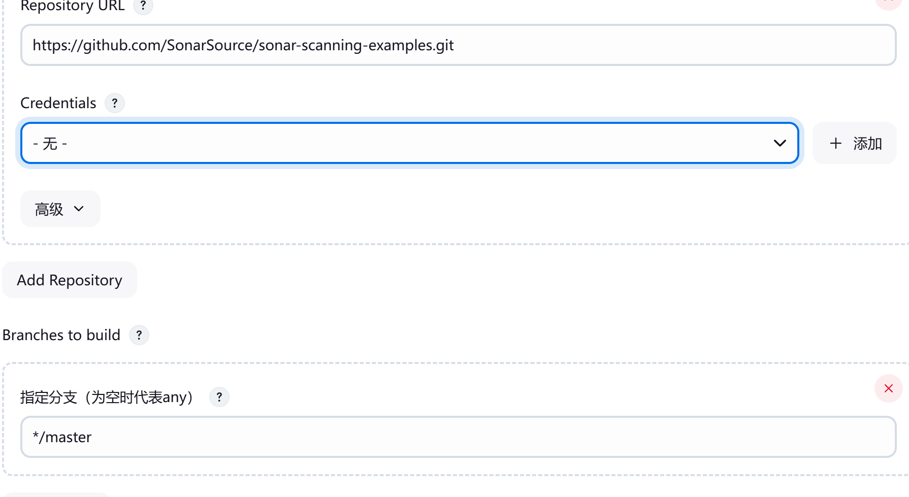 * 「Source Code Management」→ 选择 Git → Repository URL:`https://github.com/SonarSource/sonar-scanning-examples.git`;