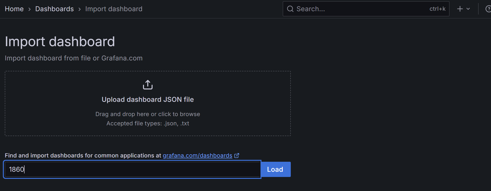 2. 在 "Import via [grafana.com](https://grafana.com/ "grafana.com")" 输入框中填写模板 ID:`1860`,点击**Load** 。