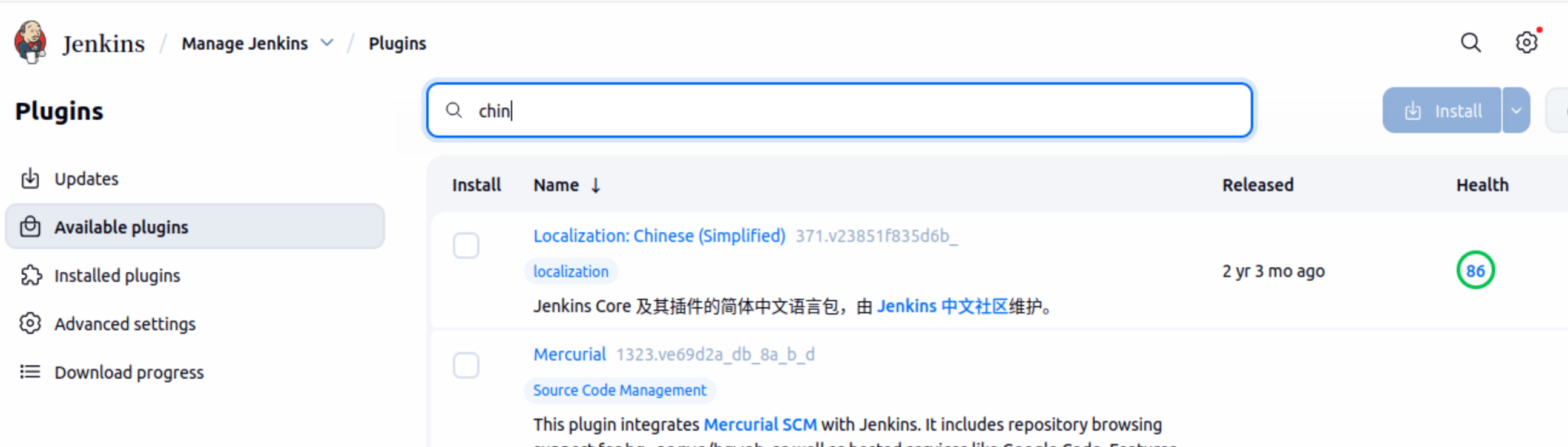 2. 点击左侧**Manage Jenkins** → **Plugins** → **Available plugins**;