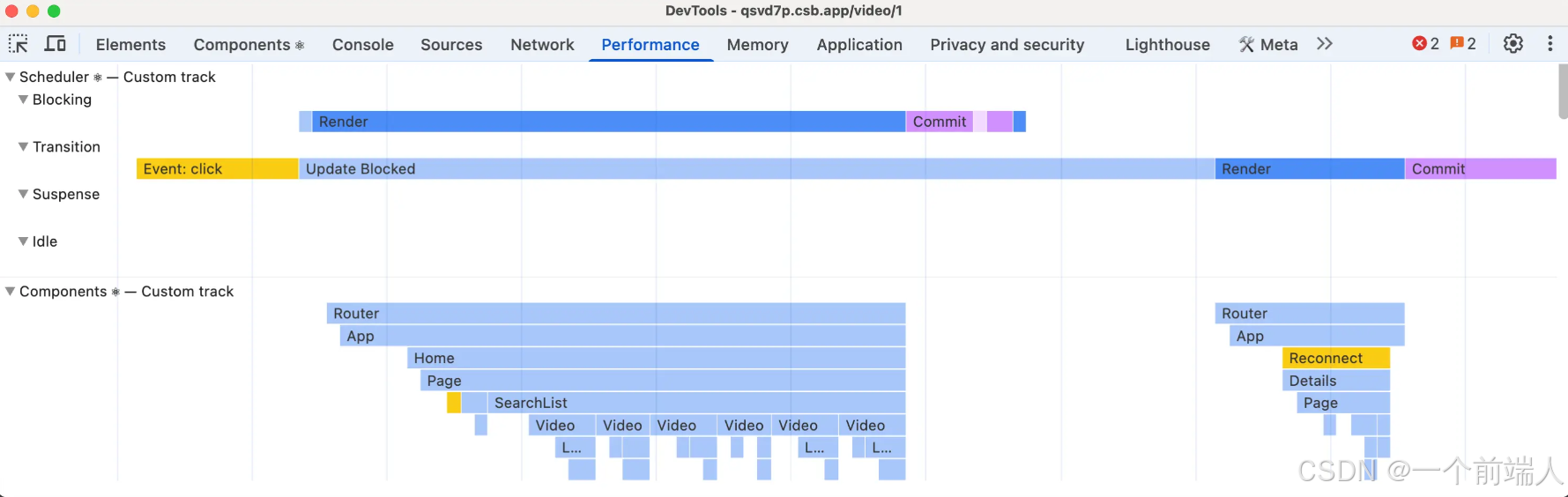 Scheduler ⚛展示 React 处理的不同优先级任务(如用户交互 blocking、startTransition 内的 transition)。 帮助理解任务调度、阻塞和渲染顺序。Components ⚛展示组件树的渲染和副作用执行情况,包括挂载(Mount)、阻塞(Blocked)等。 帮助定位性能瓶颈。