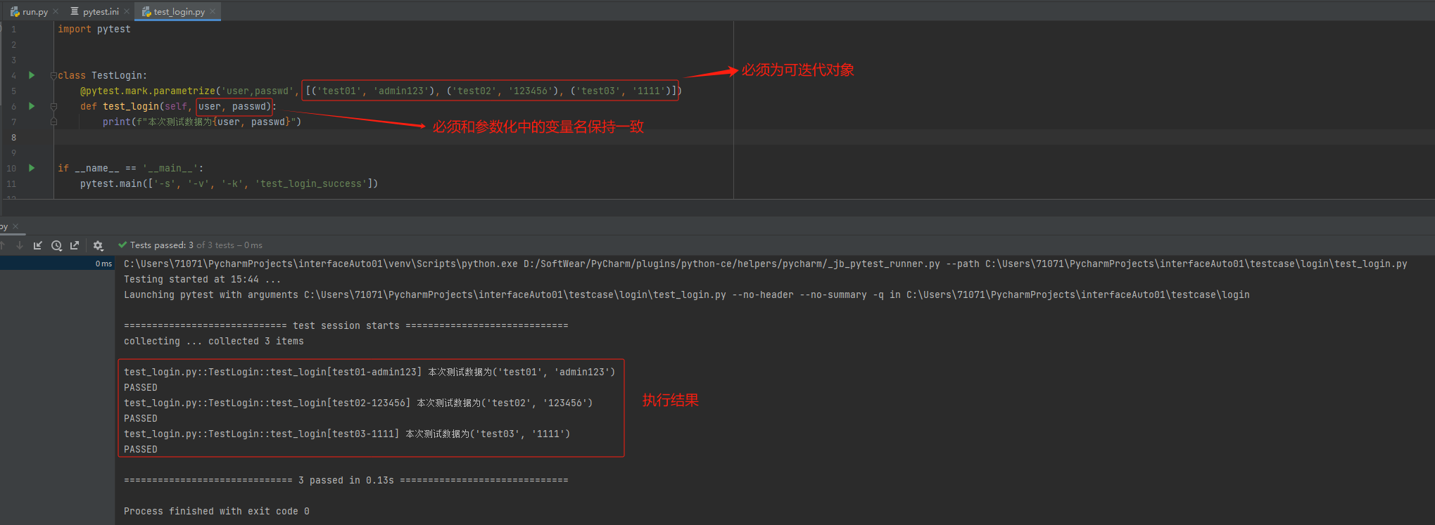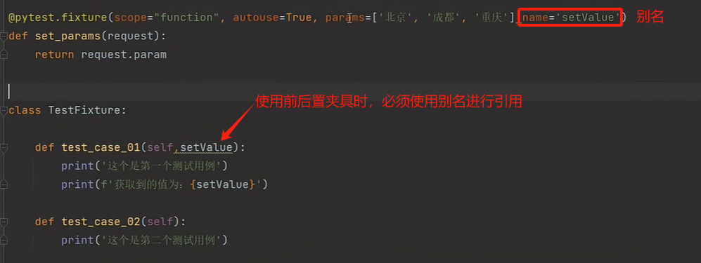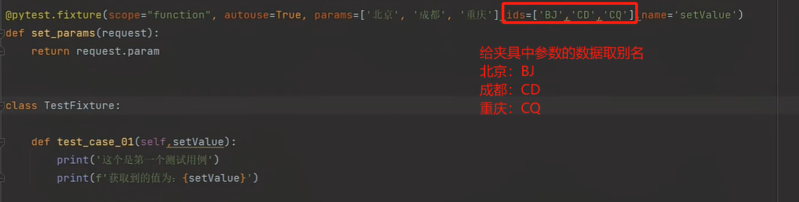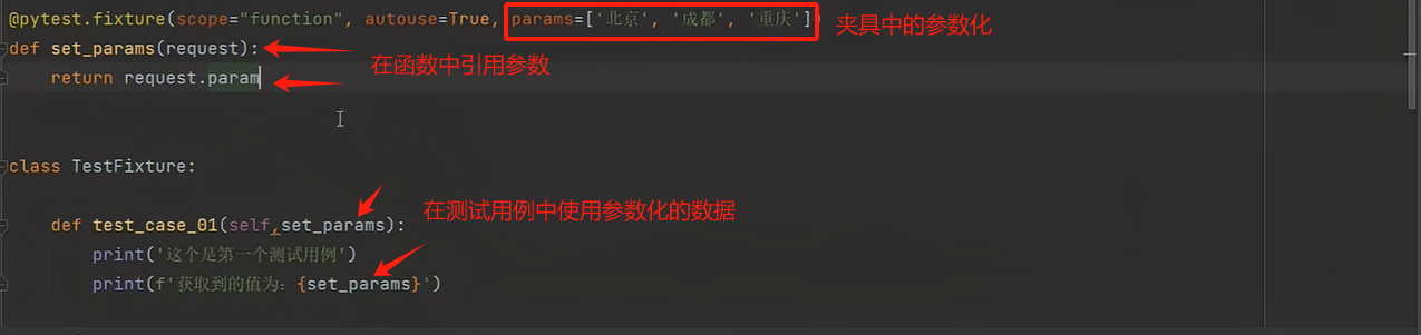 params:用于参数化选项,它允许为fixture定义多个参数值,以便在测试中使用不同的参数组合;
