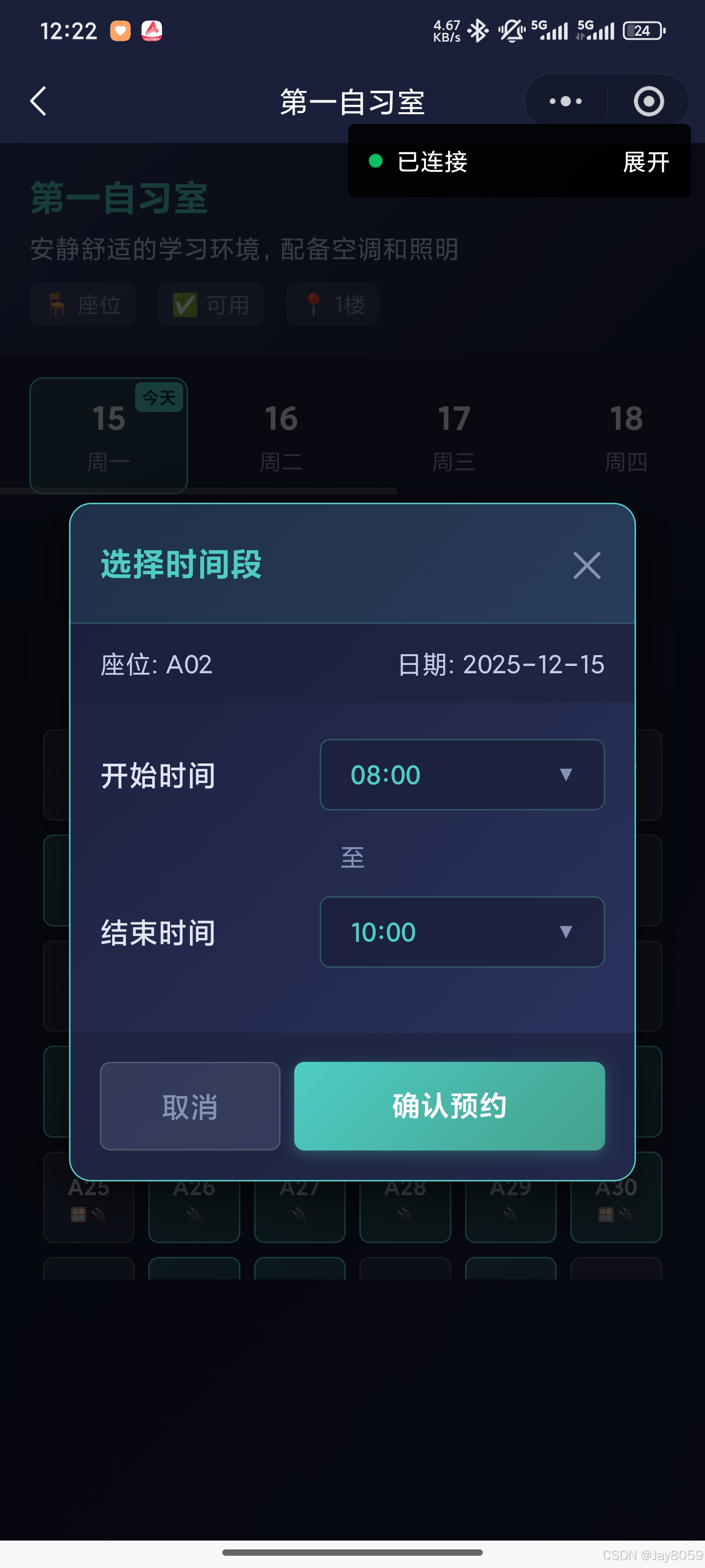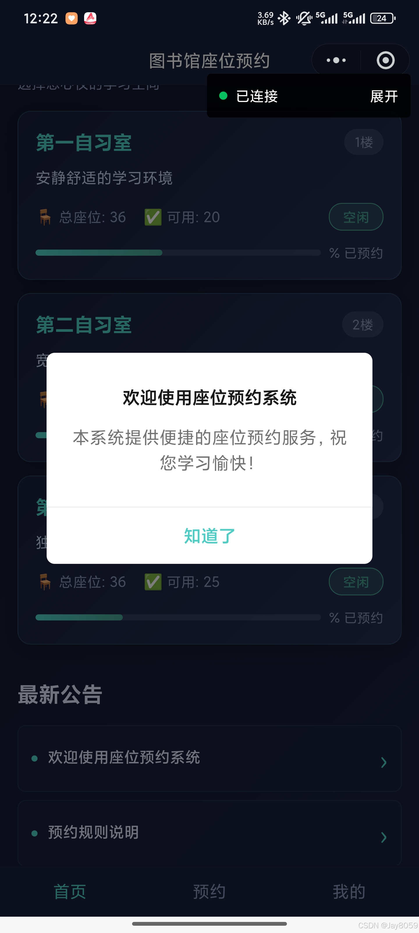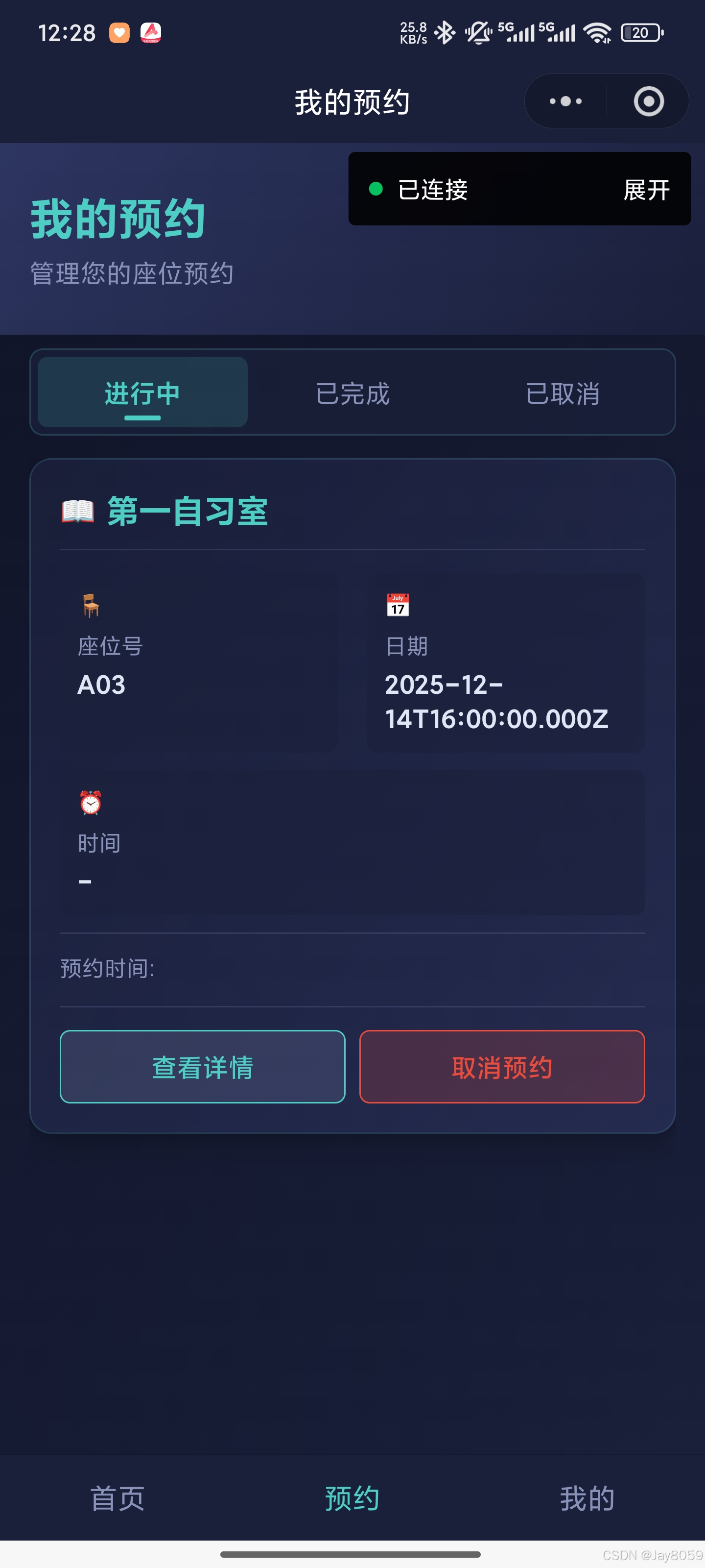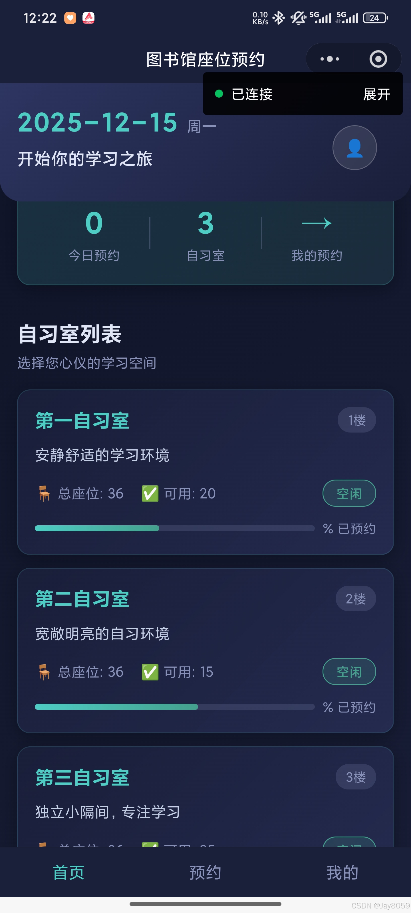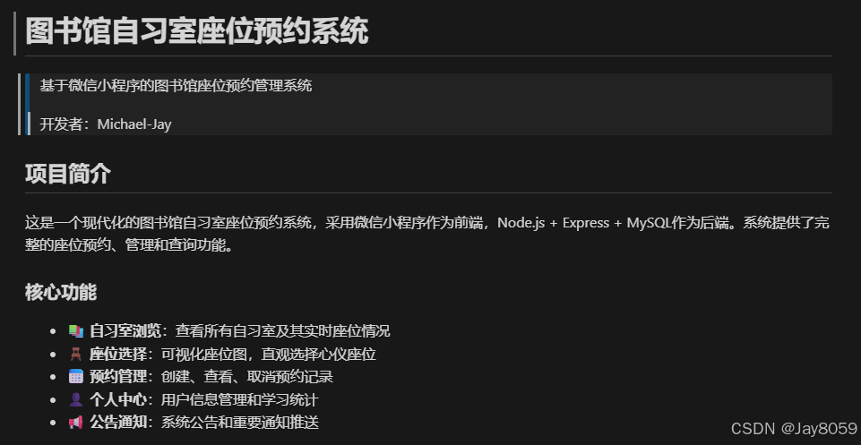 本项目是个人定制的一款现代化的图书馆自习室座位预约系统,采用微信小程序作为前端,Node.js + Express + MySQL作为后端。系统提供了完整的座位预约、管理和查询功能。