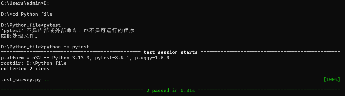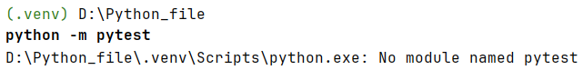 此时输入 "pytest" 还是不行,输入 "python -m pytest" 能执行。