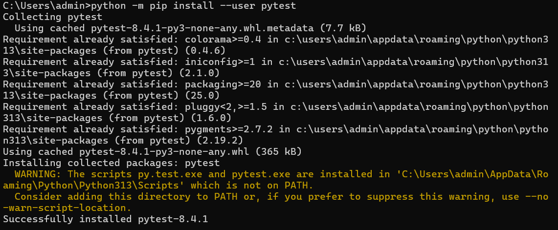 - 执行 "python -m pip install --user pytest",安装的 pytest 在 C:\Users\admin\ 下某一目录。