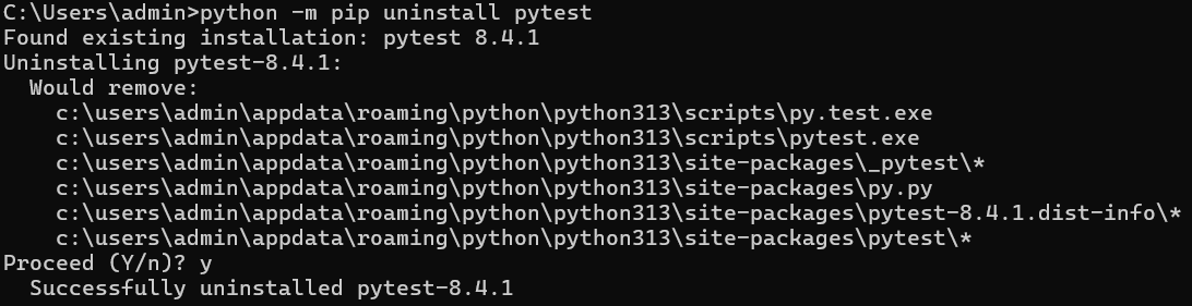 - "python -m pip uninstall pytest",卸载原来安装在 C 盘下的 pytest。