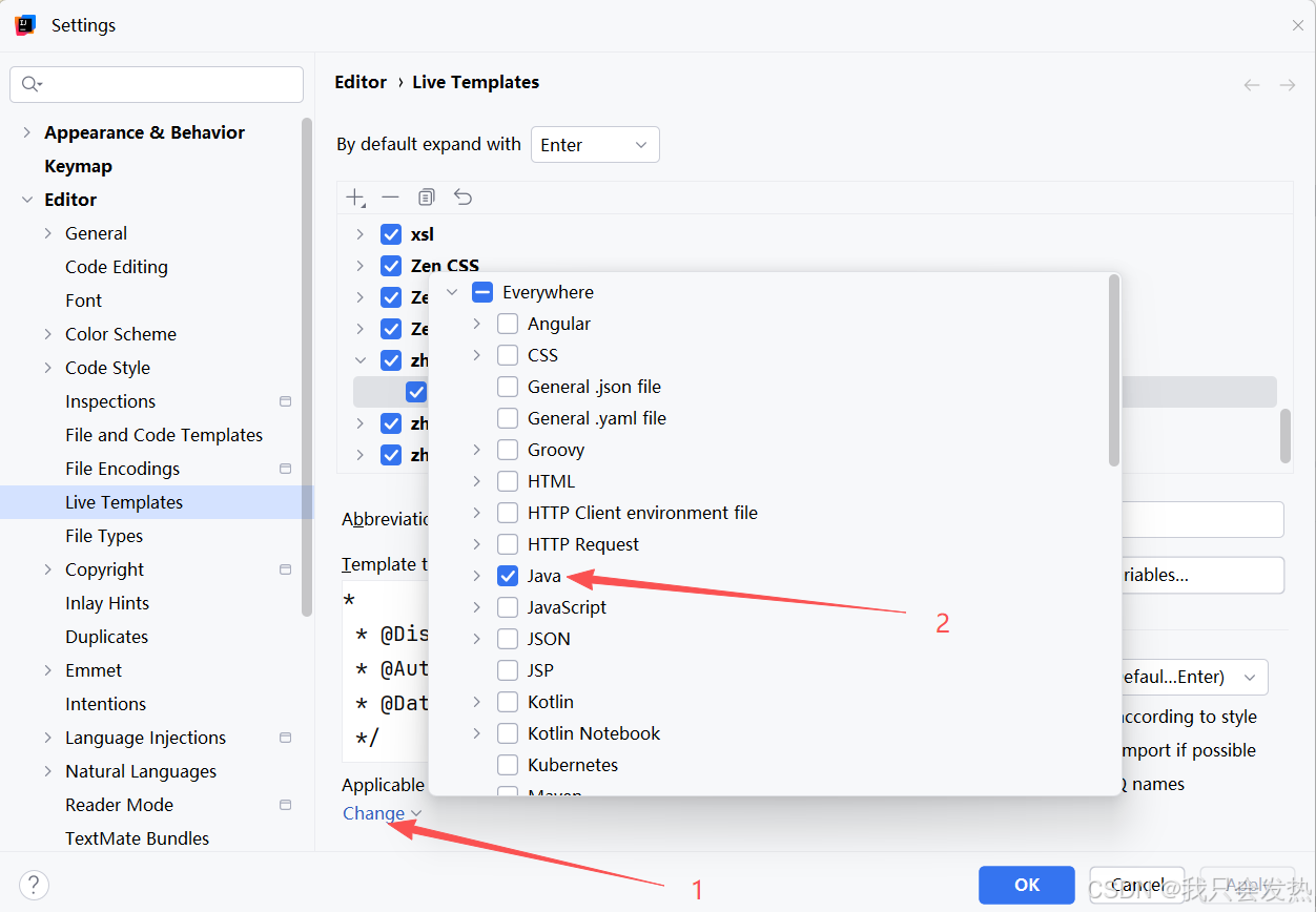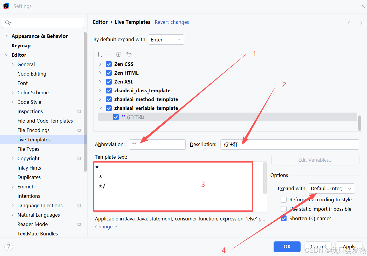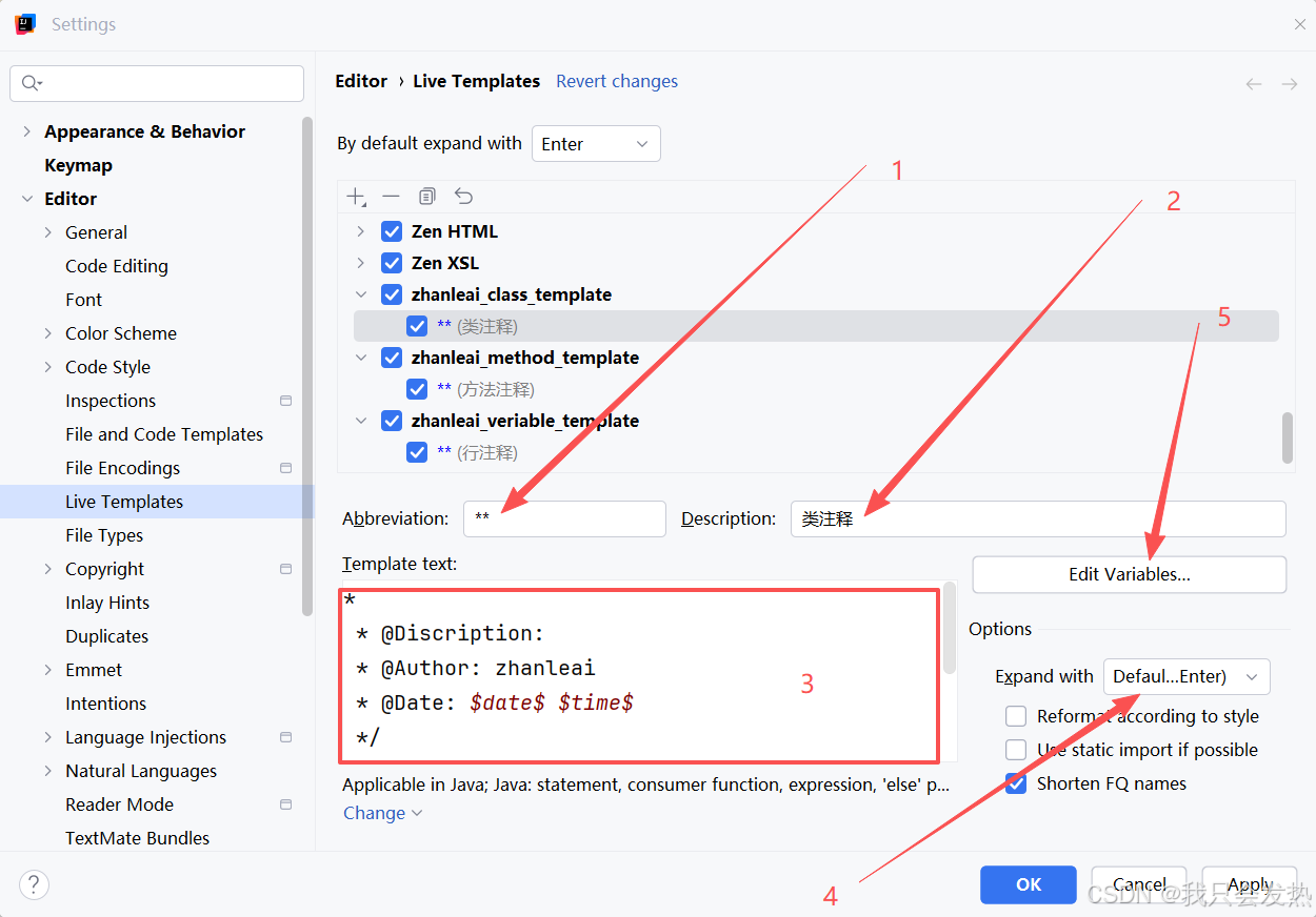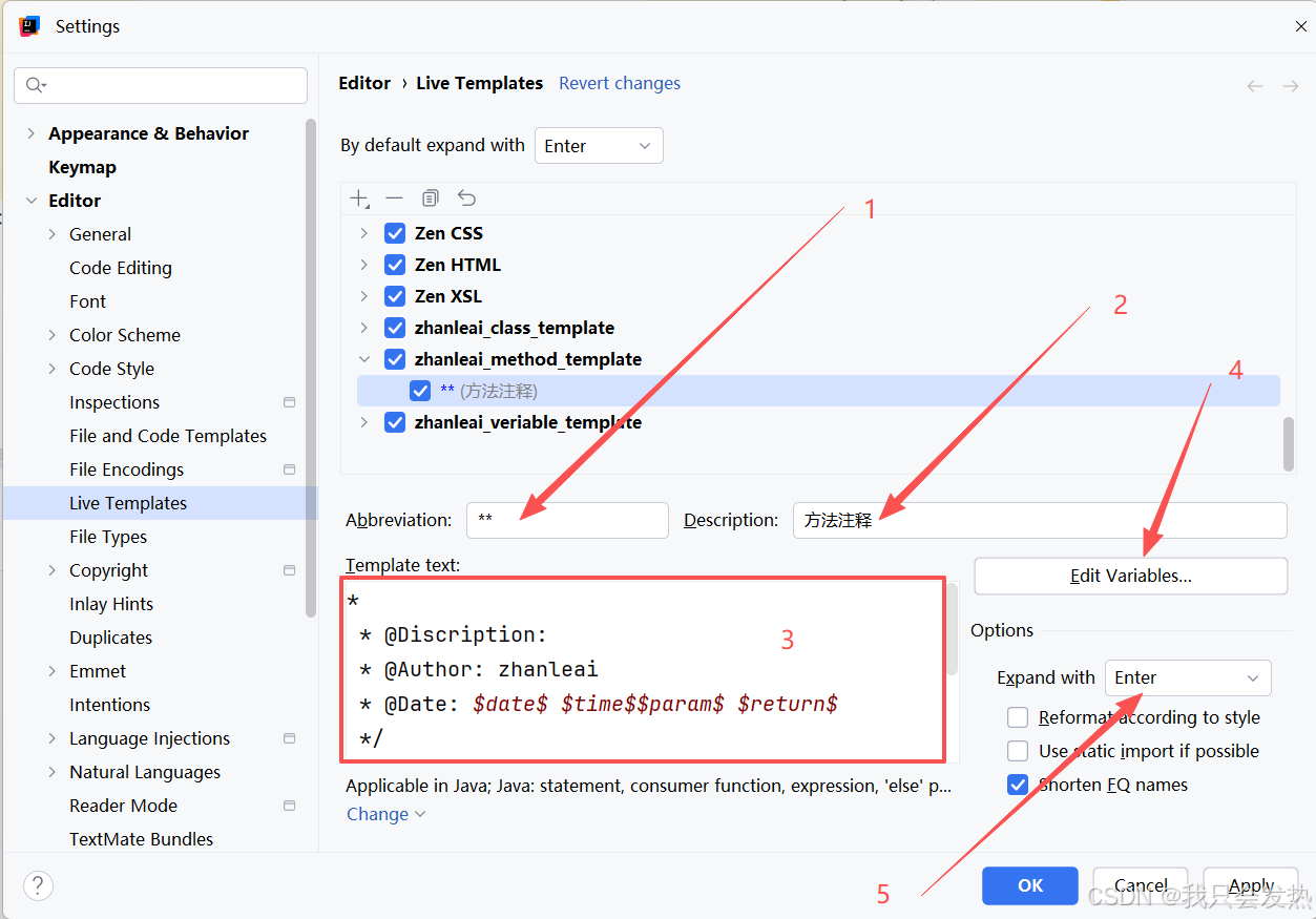 把下面这段话直接复制到 Template text,也就是下图中的第三步;Abbreviation填写 ** ,代表触发条件,后续会由 Template text 中的内容全部替代;$date$ 和 $time$ 是变量占位符,可以通过 Edit Variables 来进行编辑设置值内容;下图中的第五步,Expand with 设置的是 回车。意思是写了两个 ** 后再回车就触发该注释模板;