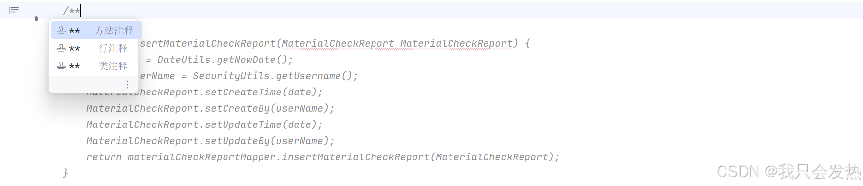 - 随便找个 java 类,在任意类名或方法名、变量名上输入 /** ,再回车,最后选择自己需要的注释模板就 OK 了