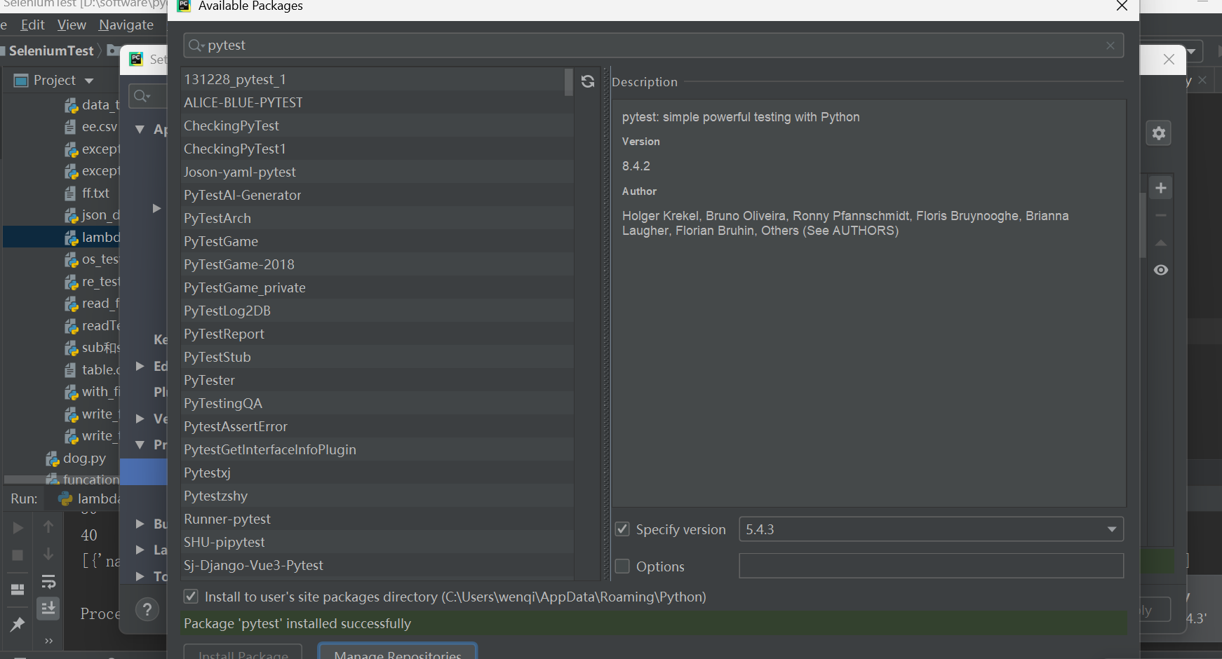 File --》setting--》project,搜索pytest可选需要版本点击install