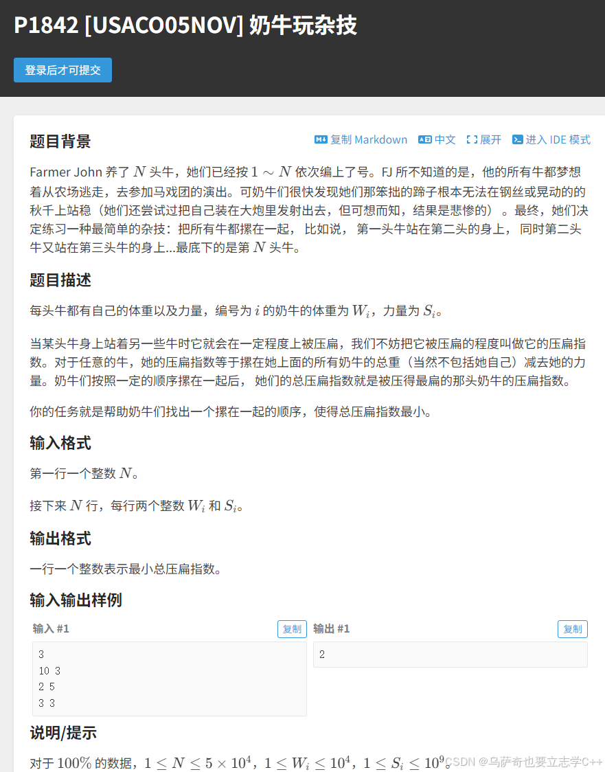 依旧延续第二题的思路,要让总压扁指数小就需要让每次比较的两个元素都能取到更小的压扁指数,这就是我们常说的局部最优推导全局最优。在已经排好序的序列中选出两个相邻的元素i和j,奶牛i重wi,力量是si,奶牛j重wj,力量是sj,在它们上面的奶牛总重是w,假设i在j前时能取到更小的压扁指数,也就是: