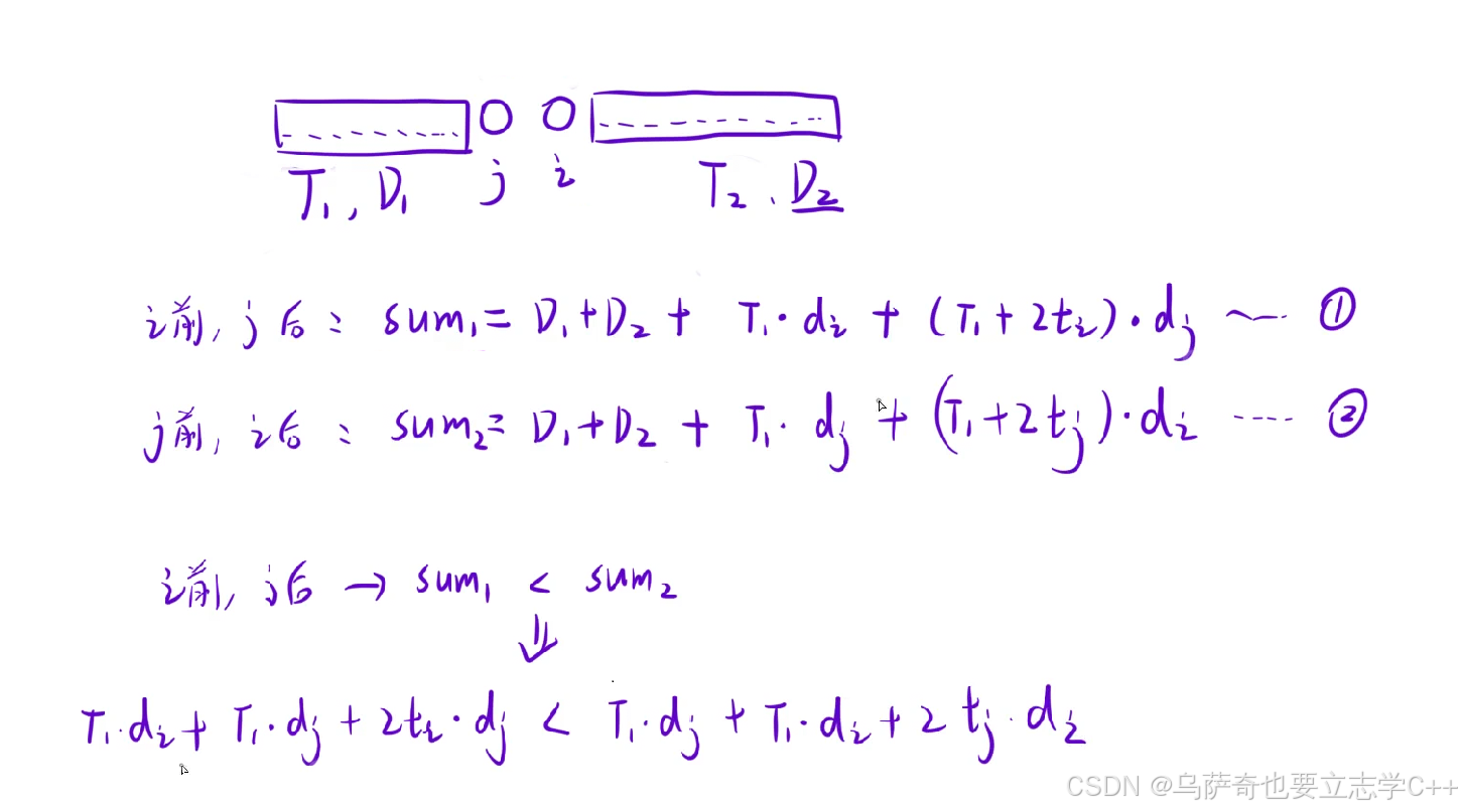 以本题为例,我们选出排好序的序列中两个相邻的奶牛i和j,它们俩距离牛圈的距离分别是ti和tj,每分钟分别吃掉di和dj朵花,在它们前面的所有已经排好序的奶牛全部被赶回牛圈需要消耗的时间是T1,吃掉的总花朵数是D1,在它们后面的所有已经排好序的奶牛全部被赶回牛圈需要消耗的时间是T2,吃掉的总花朵数是D2,当i和j交换后并不会影响T1、D1、T2、D2,所以符合"交换这两个元素后对前面以及后面已经排好序的序列的结果不造成影响",接下来我们就开始推公式: