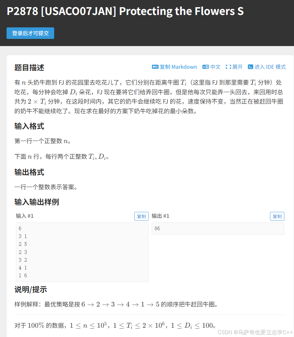 注意本题计算结果时需要用一个变量t存放下一头奶牛的总吃花时间,据此变量排好序的序列得出最终结果。