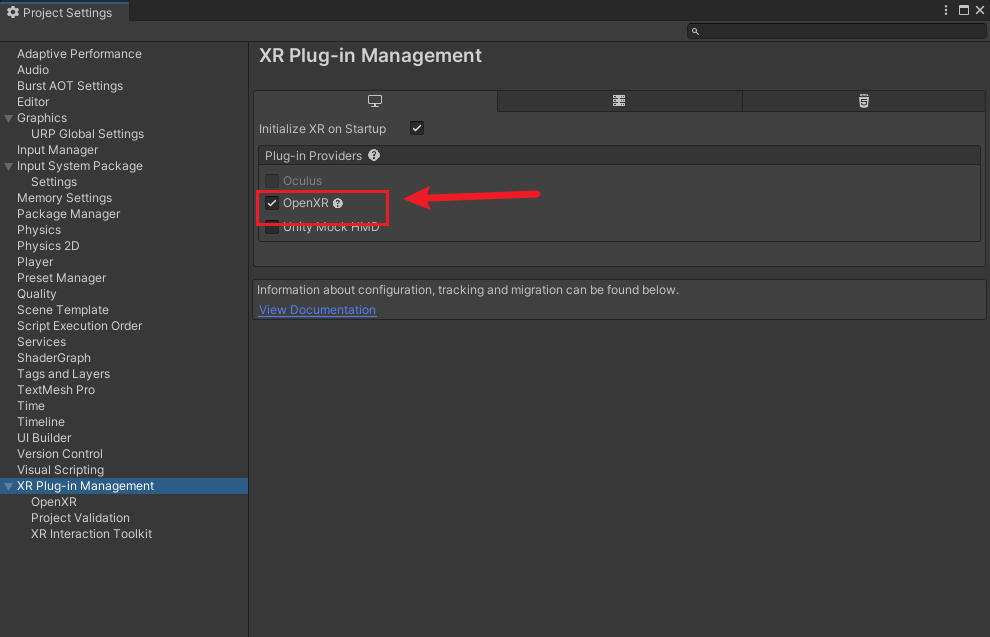 ⚠️ 安装后,需要在 Project Settings → XR Plug-in Management 中启用 OpenXR。