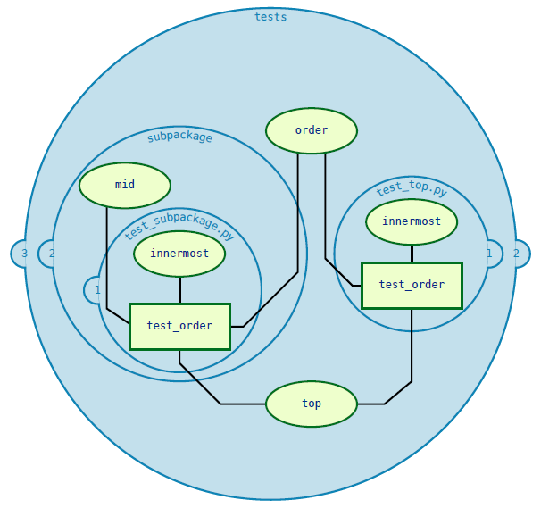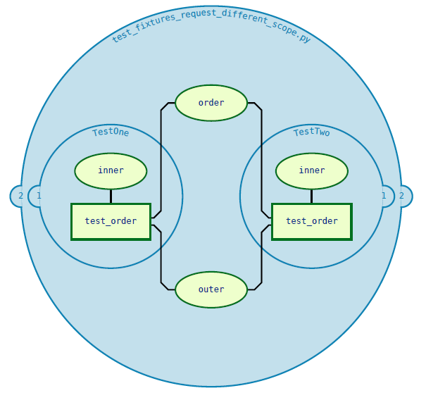 例如,这里有一个测试文件,其中包含一个fixture(outer),它从一个未定义的范围中请求另一个fixture(inner):
