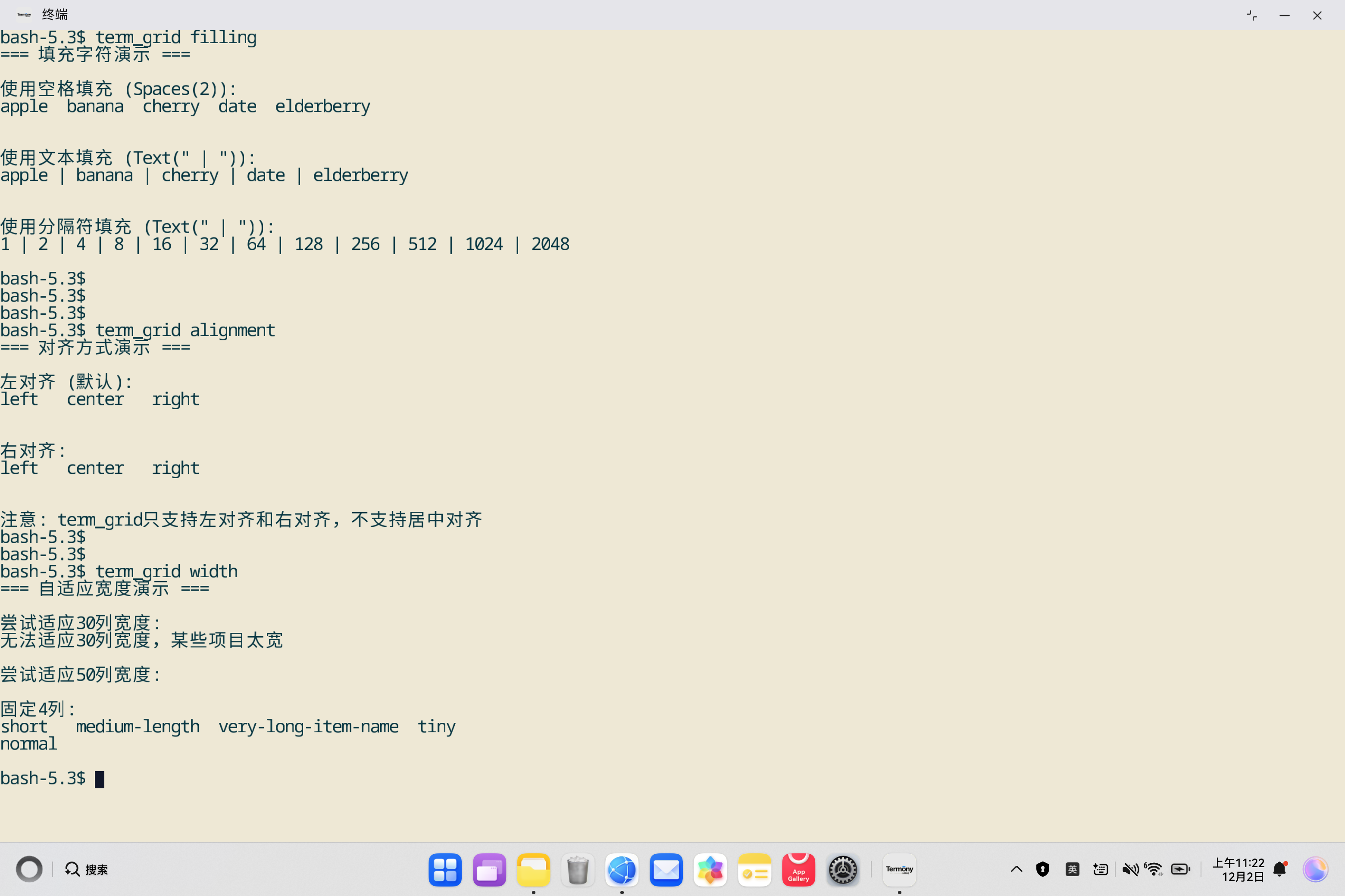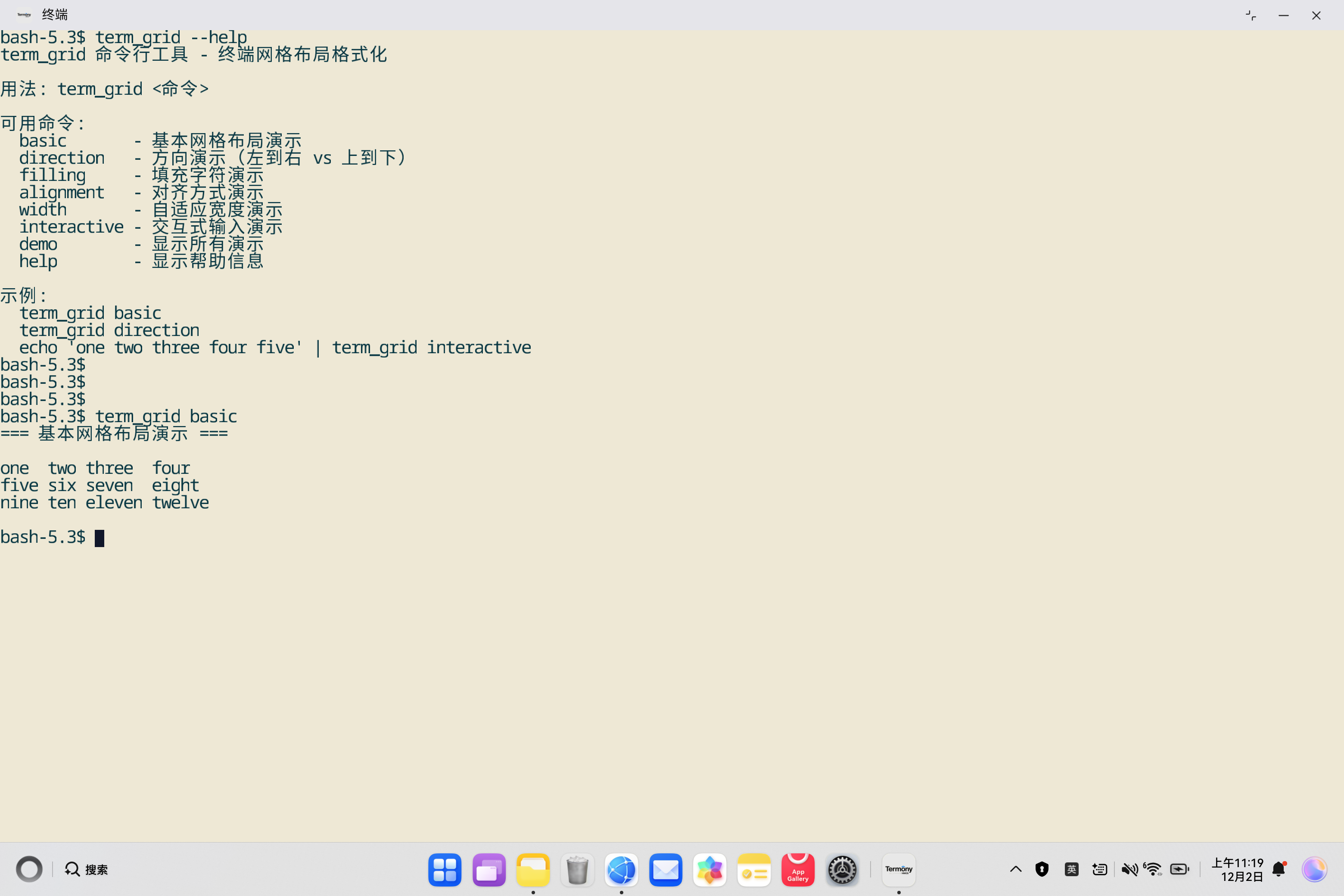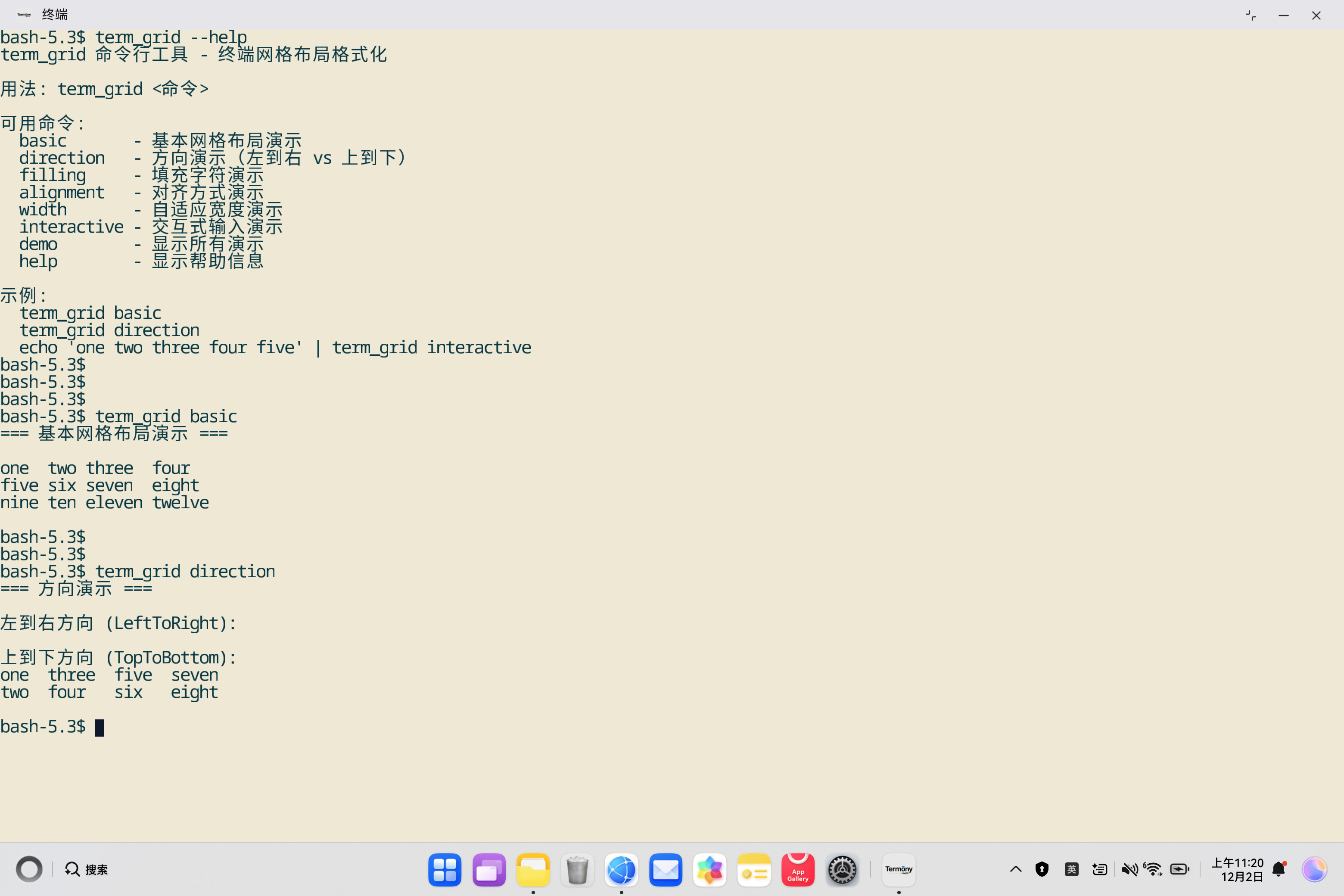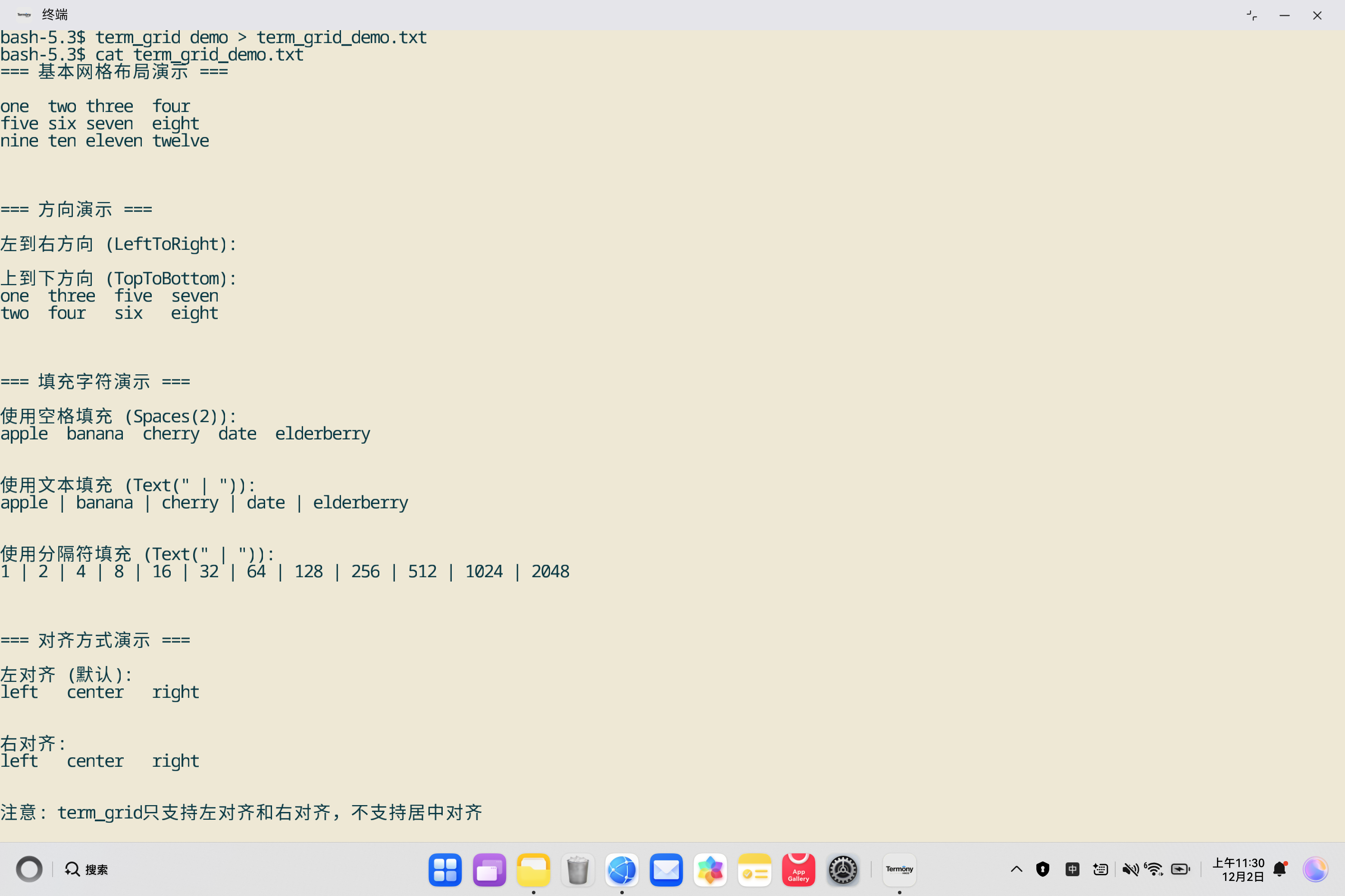 term_grid 是一个用Rust编写的终端网格布局格式化库,用于将文本数据排列成适合固定宽度字体的网格格式。本项目基于term_grid库创建了一个命令行工具,用于演示和测试终端网格布局功能。