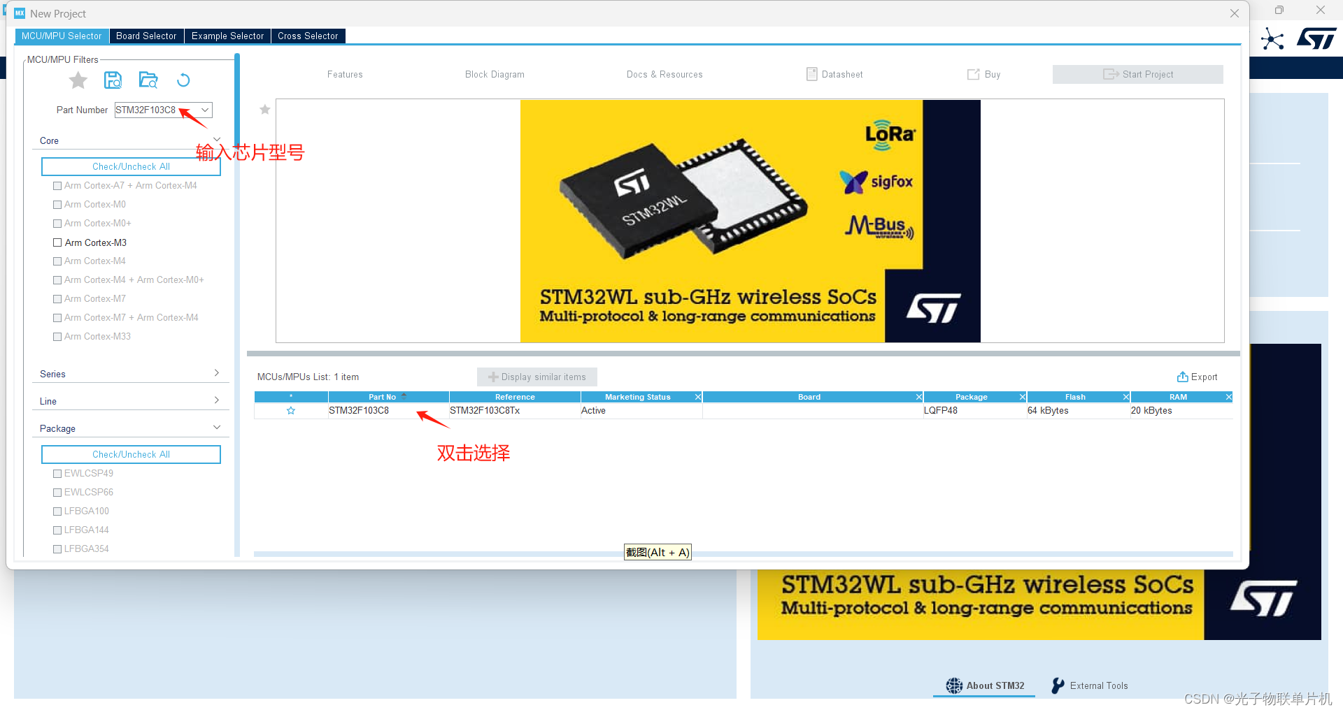 如图箭头处先输入芯片型号,目前这边输入 STM32F103C8,再双击选择,就确定了芯片型号。