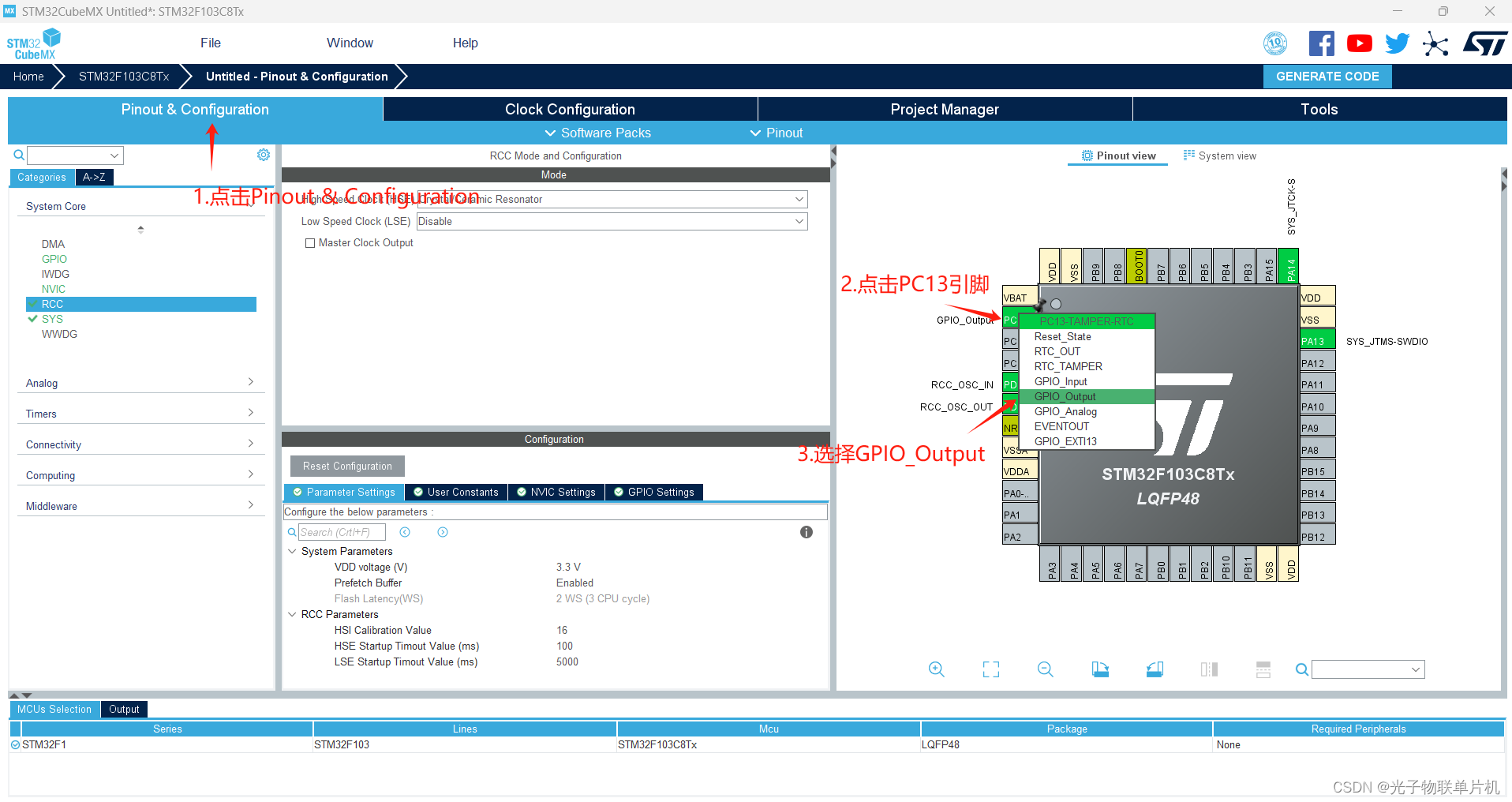 按图的 1,2,3 步骤完成 PC13引脚配置成 GPIO 输出设置。