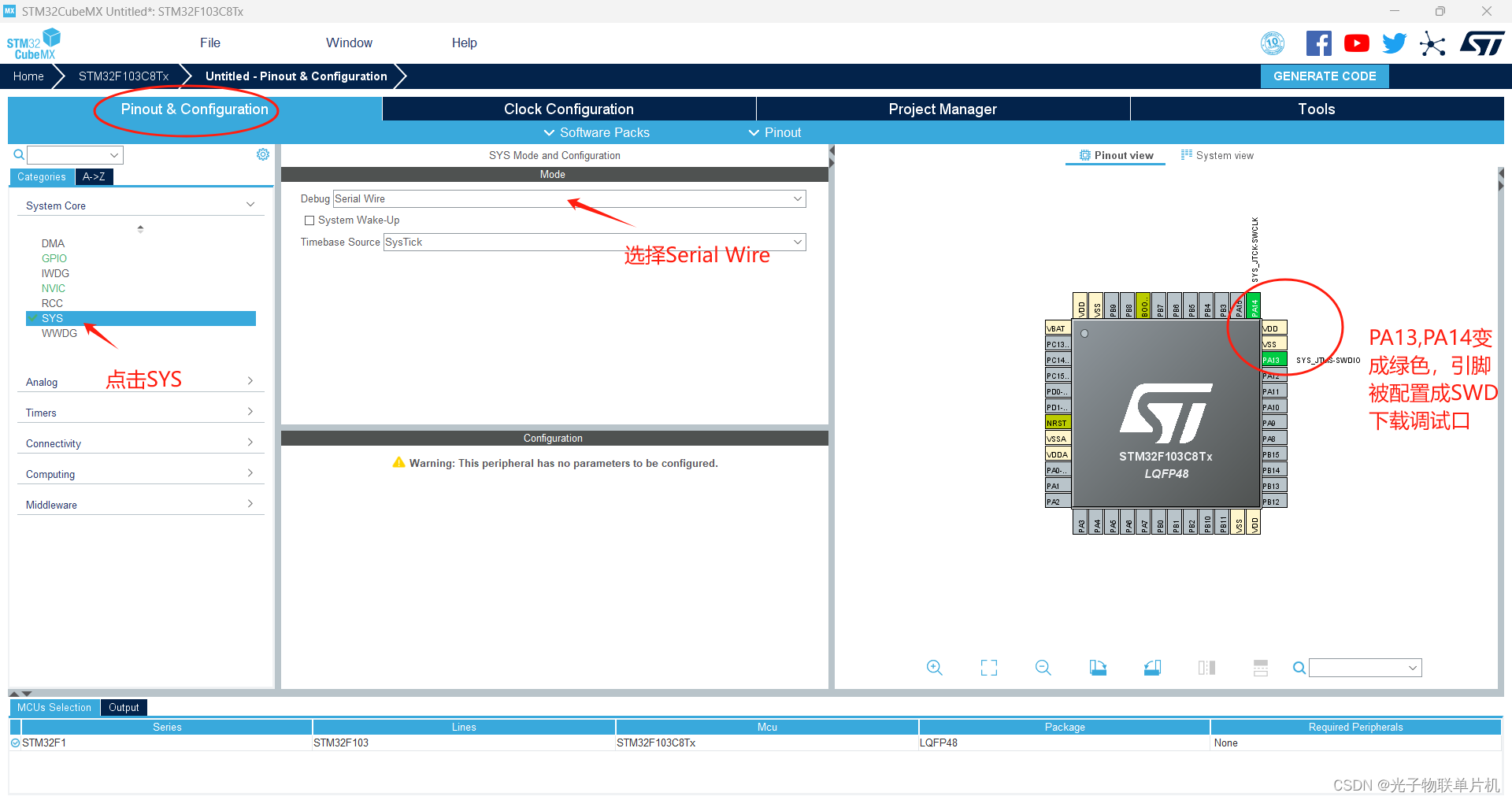 在 Pinout&Configuration 栏目的 System Core 下,先点击 SYS,再勾选 Debug栏目选择Serial Wire ,就配置好 SWD 下载方式的引脚。