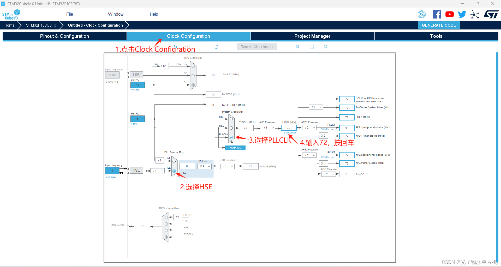 如图点击 Clock Configuration 栏目,按图的 1,2,3,4 步骤完成采用外部8M晶振,系统72MHZ 主频设置。