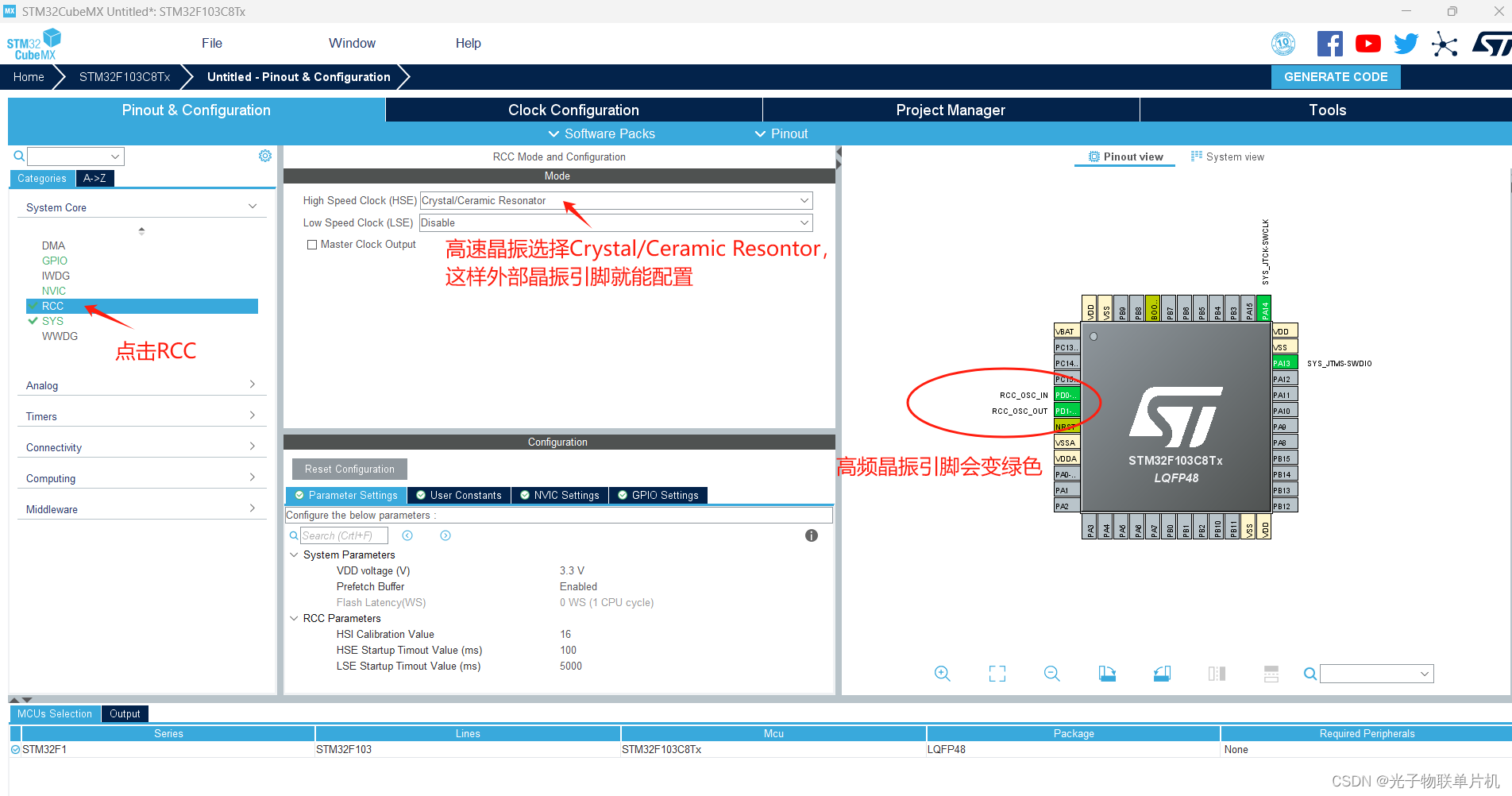 先点击 RCC,在 HSE 配置中选择 Crystal/Ceramic Resonator 外部晶振设置。