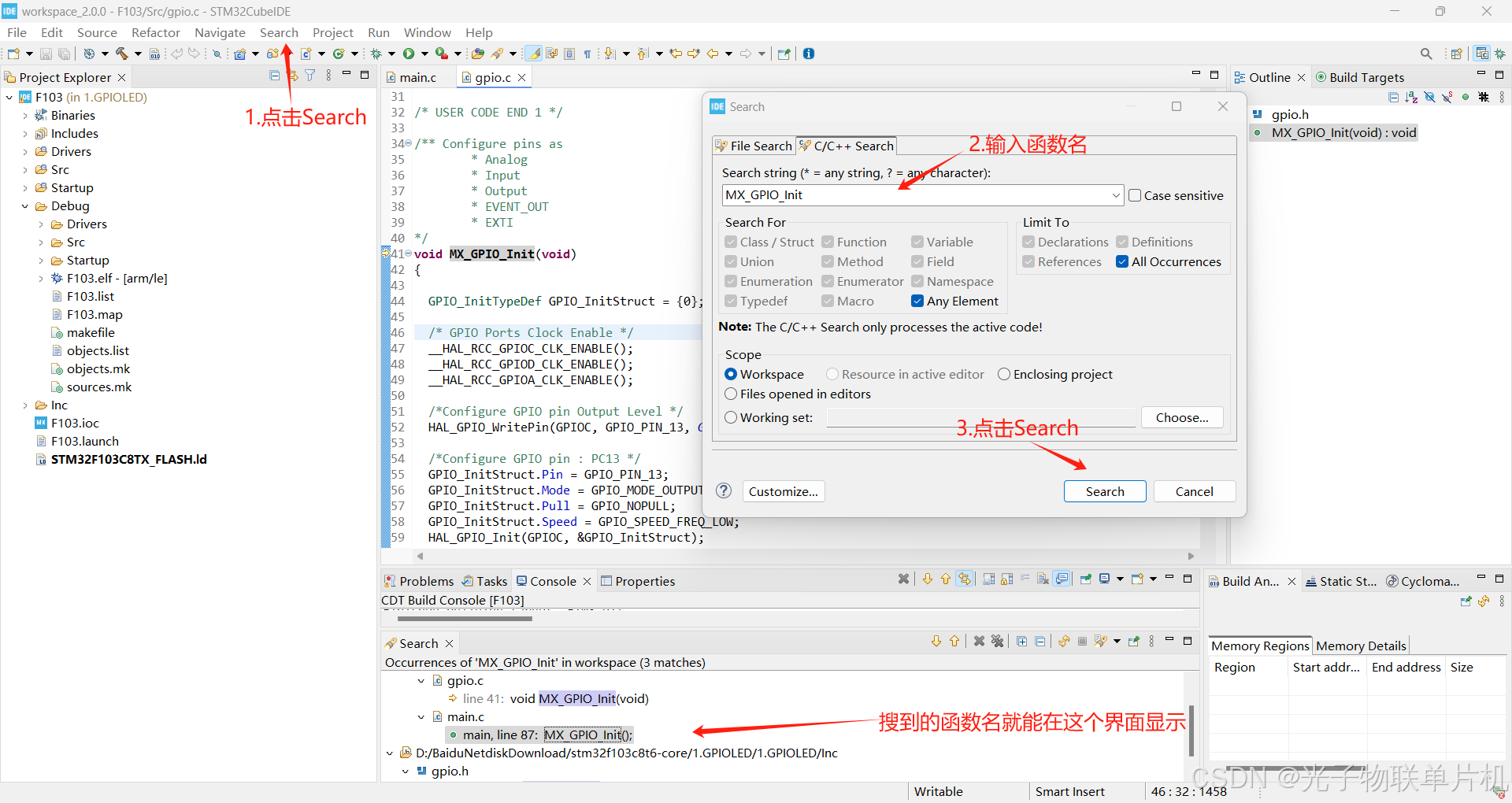 编辑的过程中需要查找函数的定义和调用地方,也可以如下操作,点击Search,输入函数名,点击Search。