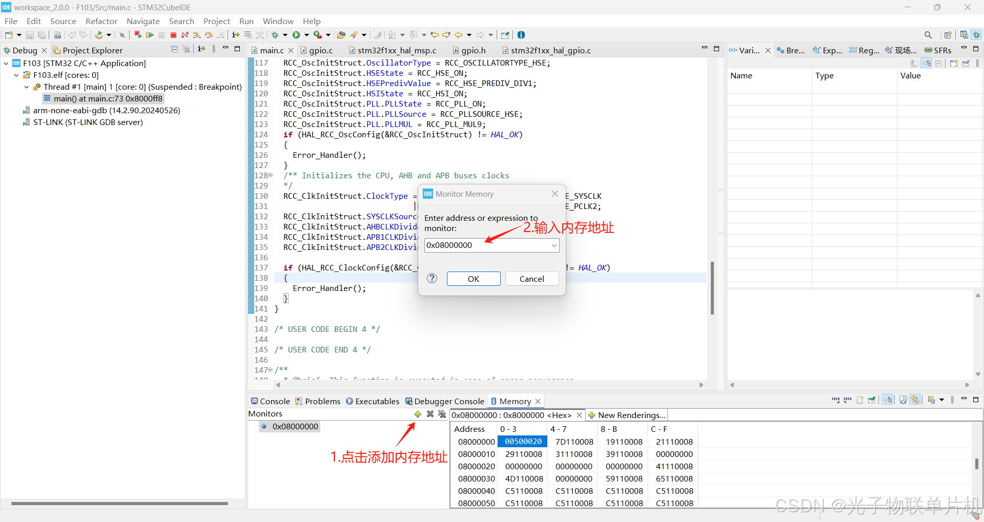 在跳出来的Monitor Memory中的Address里输入地址值就可以显示内存的内容。