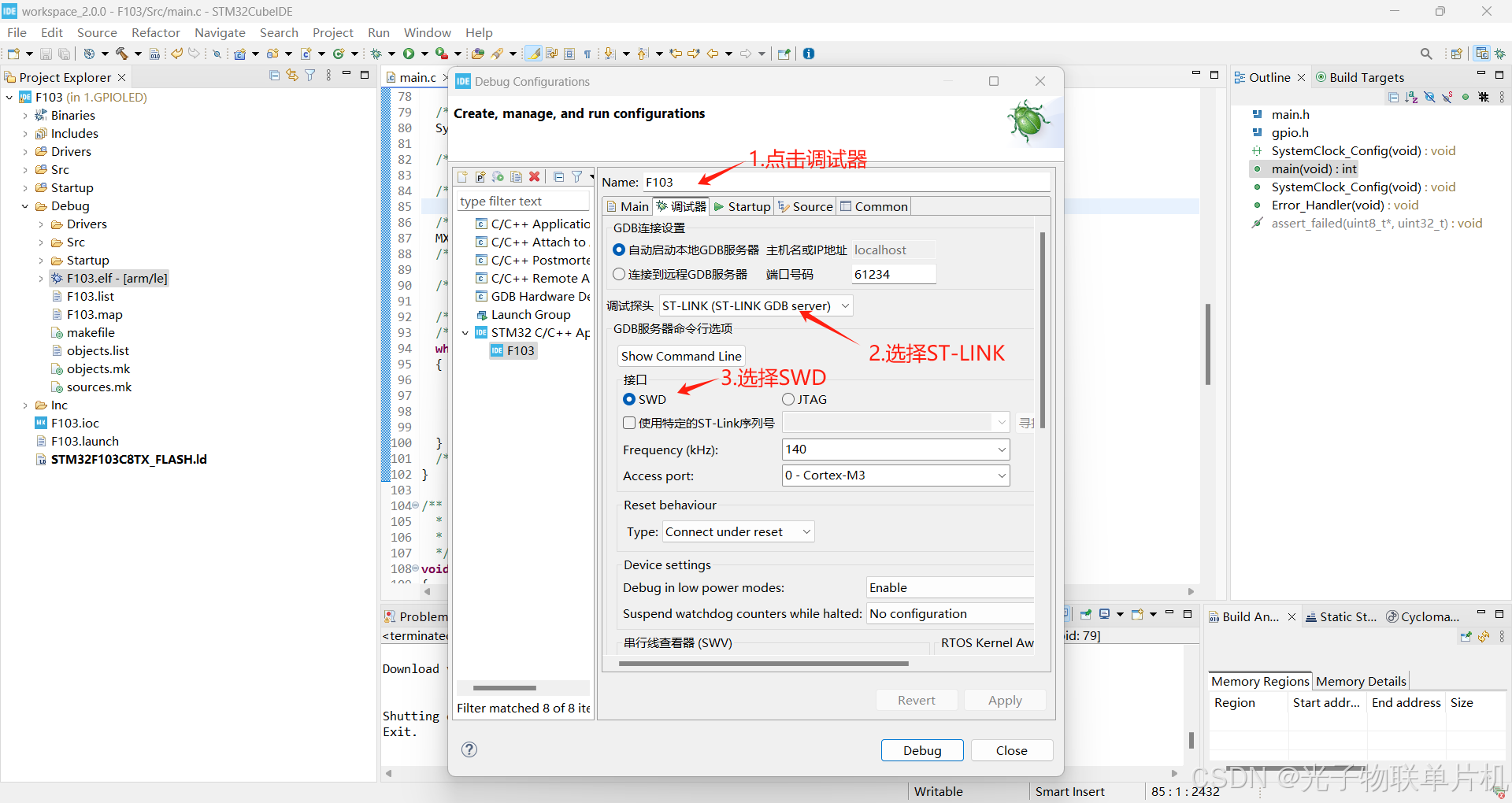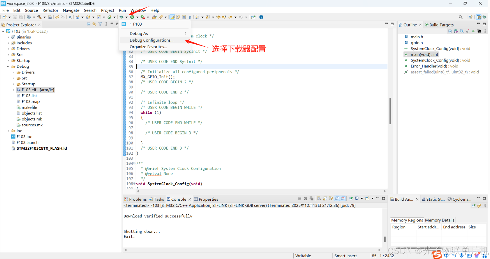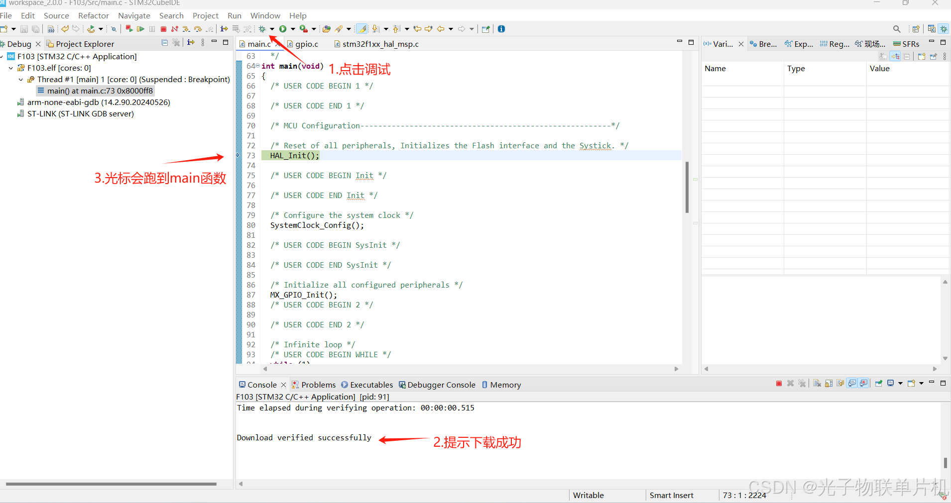 如下图所示,点击调试,会调试下载成功,同时光标会跳转到main函数处。