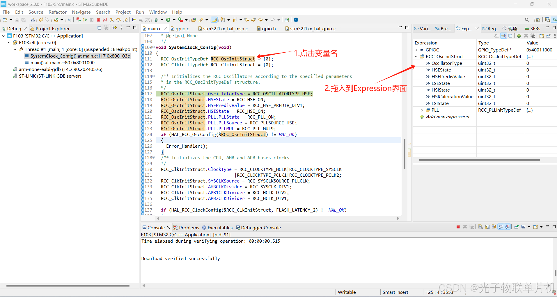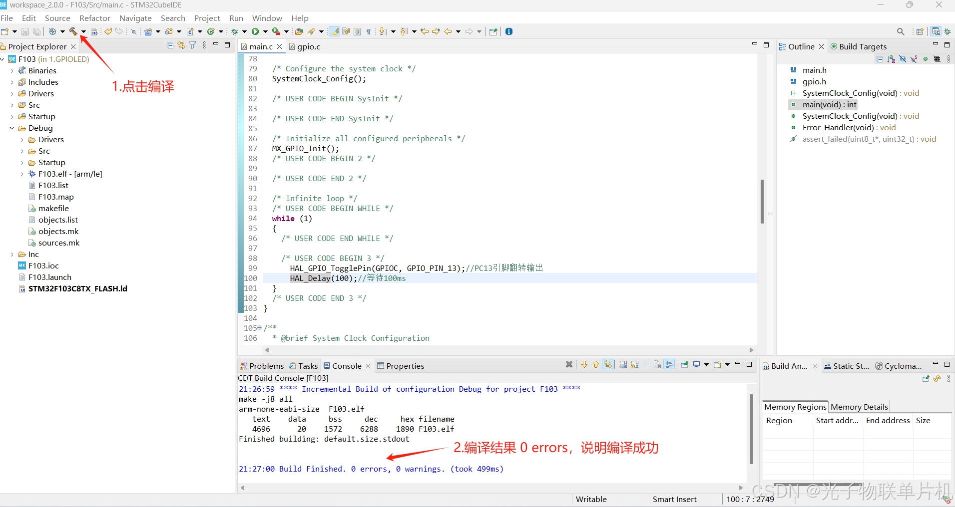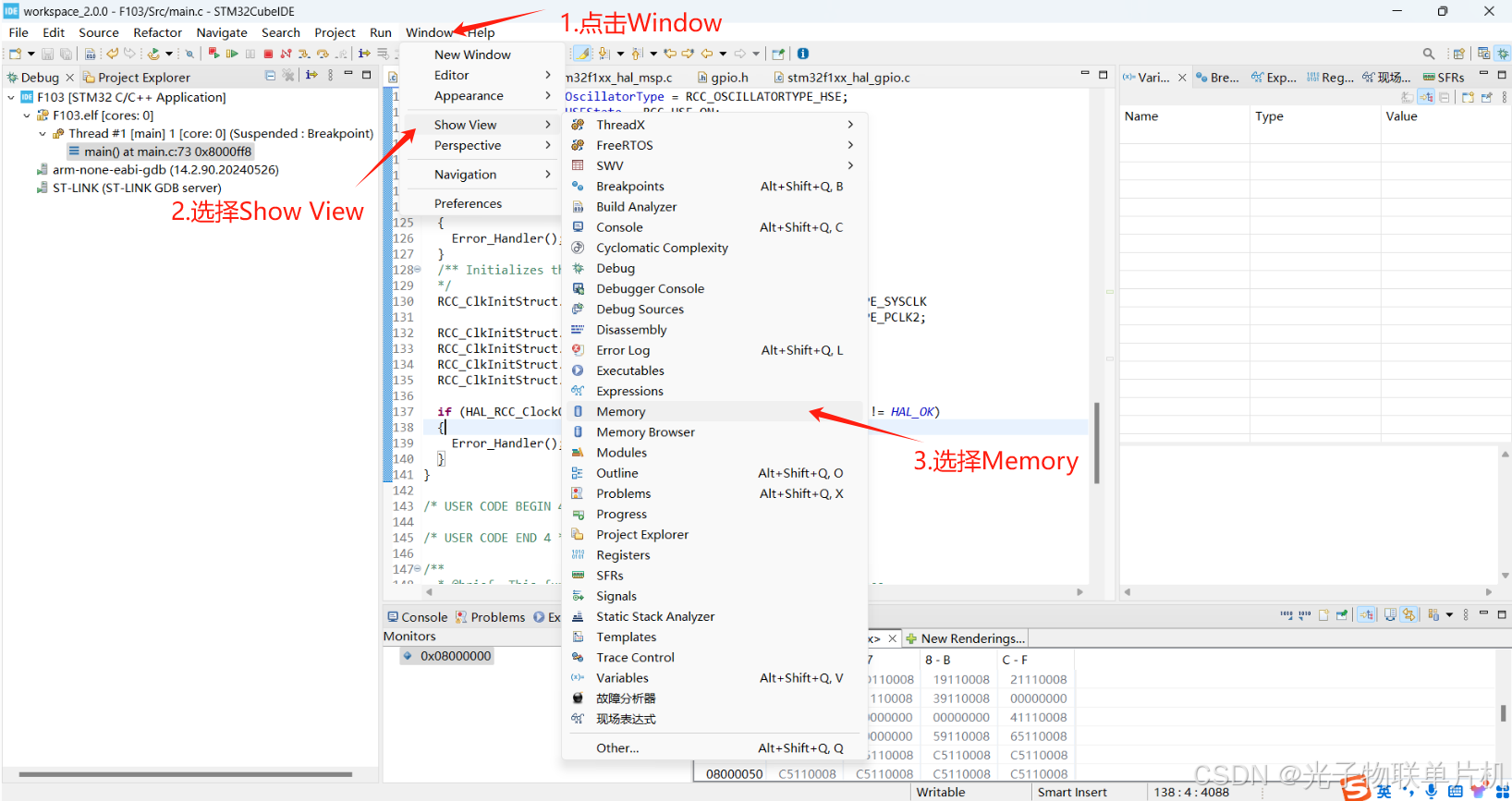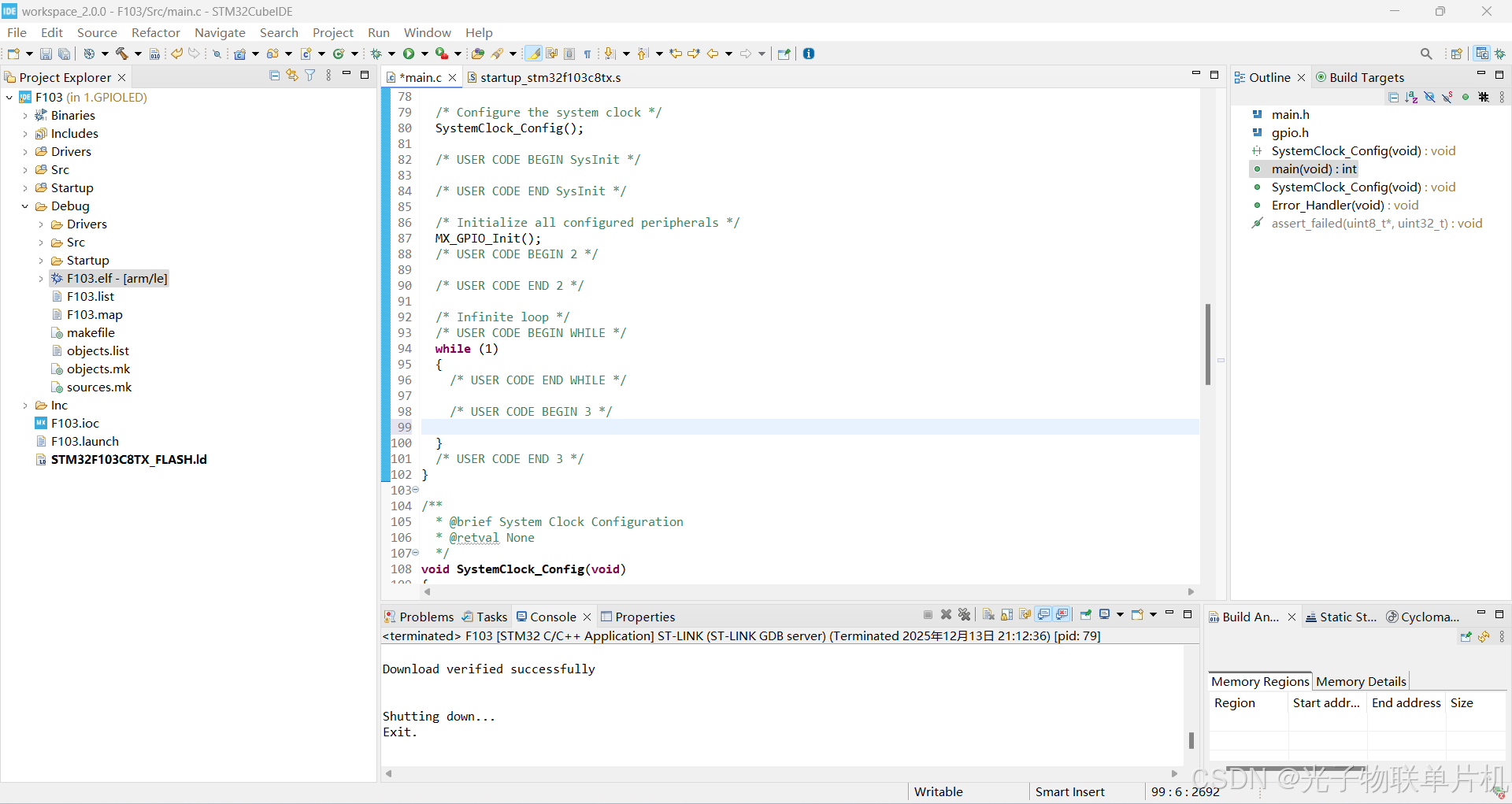 如下图所示,点击调试,会调试下载成功,同时光标会跳转到main函数处。