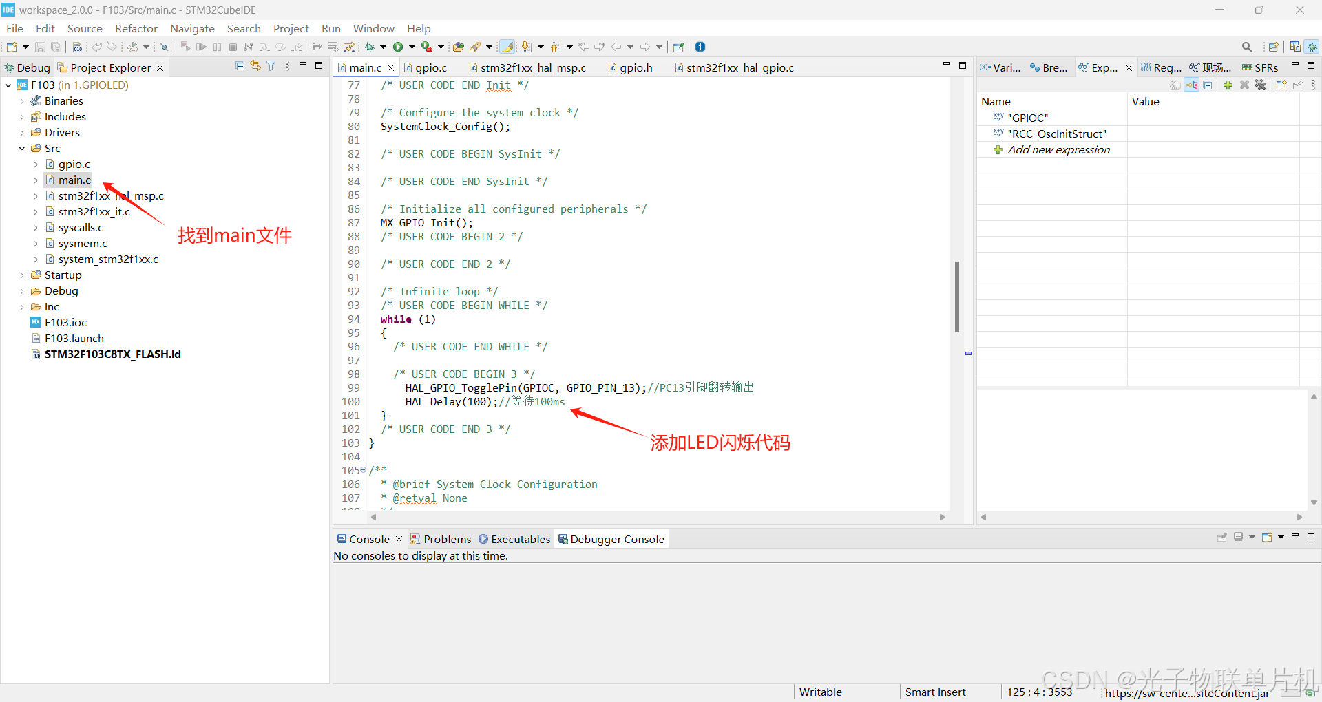示例程序已经都编辑好,如下图所示,在左边的文件夹中找到main.c文件,在main函数中添加LED闪烁的代码。