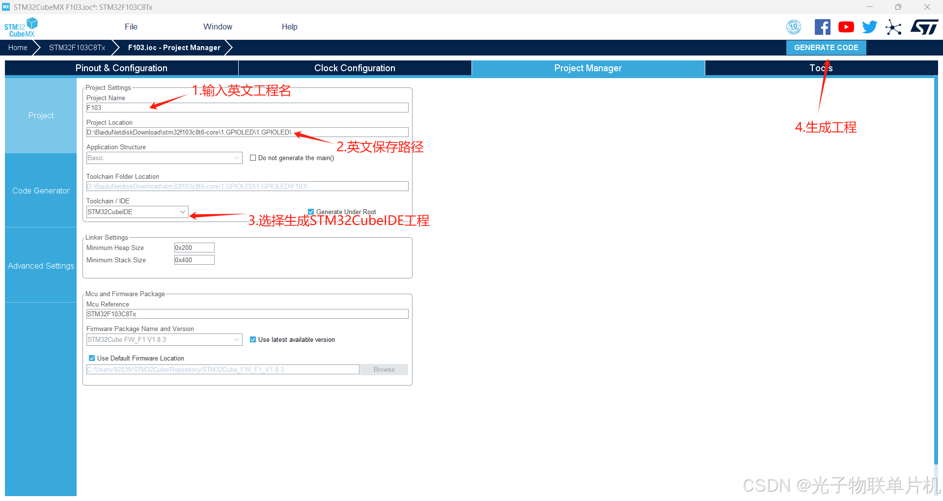 按下图的 1,2,3,4 步骤完成生成STM32CubeIDE的工程配置。