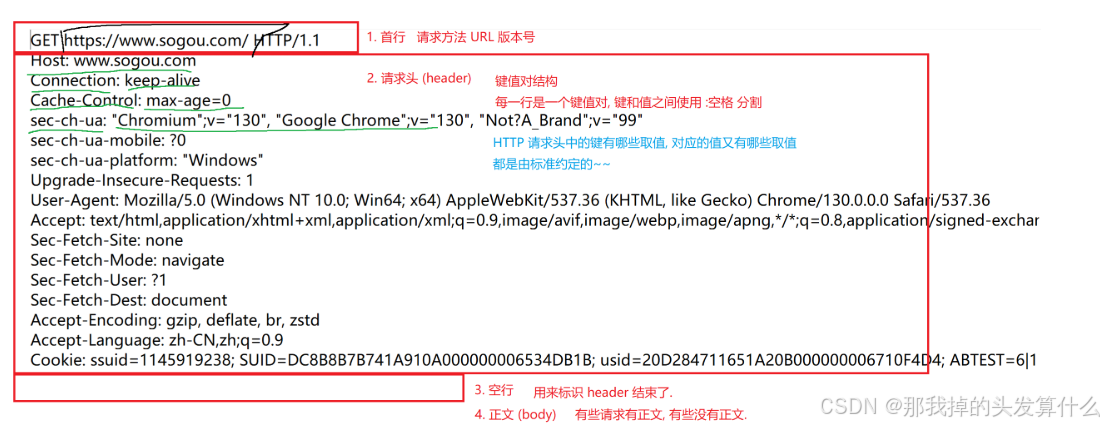 请求:1.首行2.请求头3.空行4.正文
