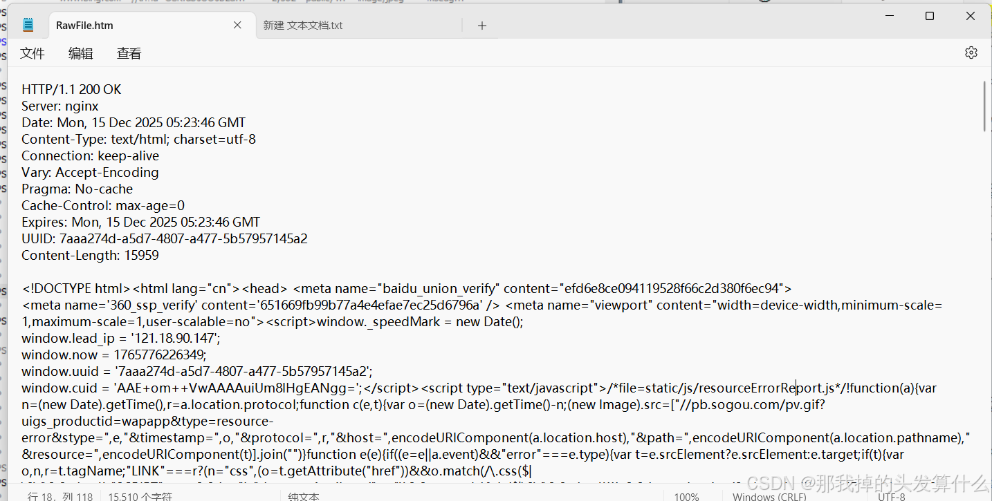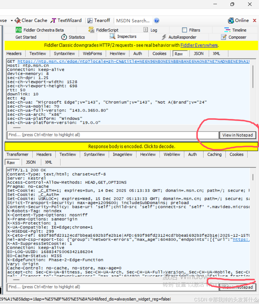 此时我们点击这个按键,就可以将这些数据使用记事本打开了。但是此时打开的话看到的还是乱码,为了节省带宽,这些数据一般是被压缩过的,我们可以点击中间那个黄色的那一行来解析数据,再打开之后就是正常文本啦~~~
