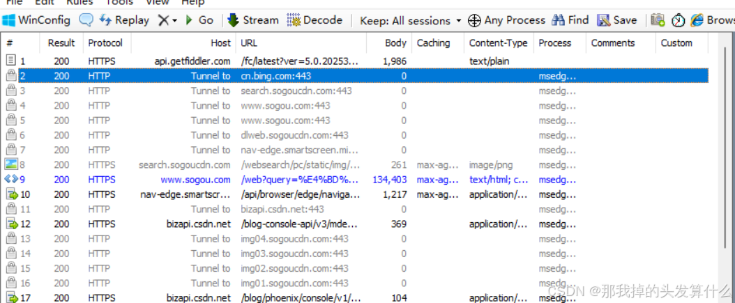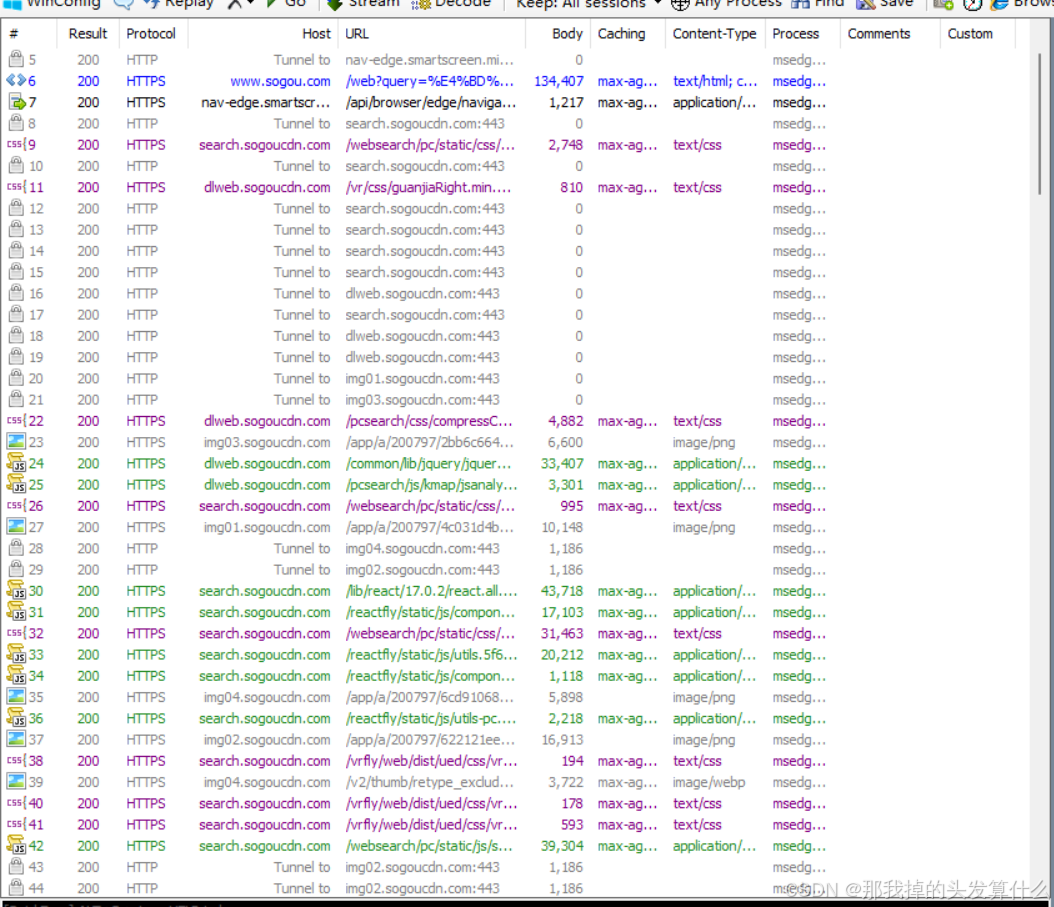 左侧窗口就是当前的请求/响应列表,这个窗口在不停的跳动,因为电脑上的很多程序都在偷偷的做一些事情。