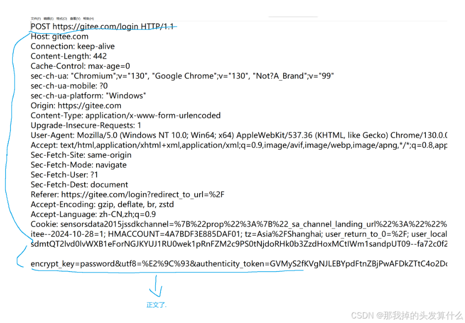 我们上面那个例子中请求的正文是空的,确实许多请求的正文部分都是没有数据的,但是某些场景下还是需要的,就比如下面的登录请求: