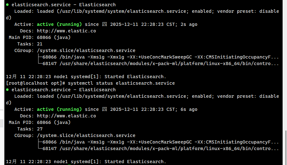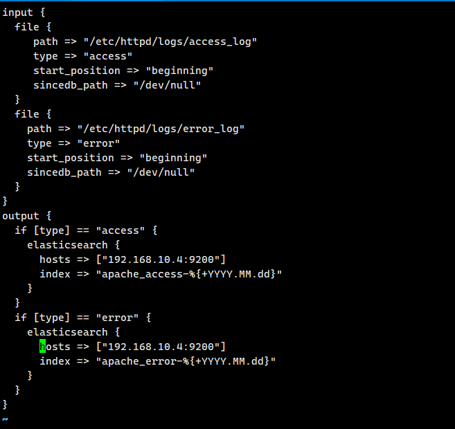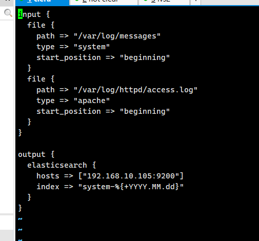 修改 Logstash 配置文件,让其收集系统日志/var/log/messages,并将其输出到 elasticsearch中。
