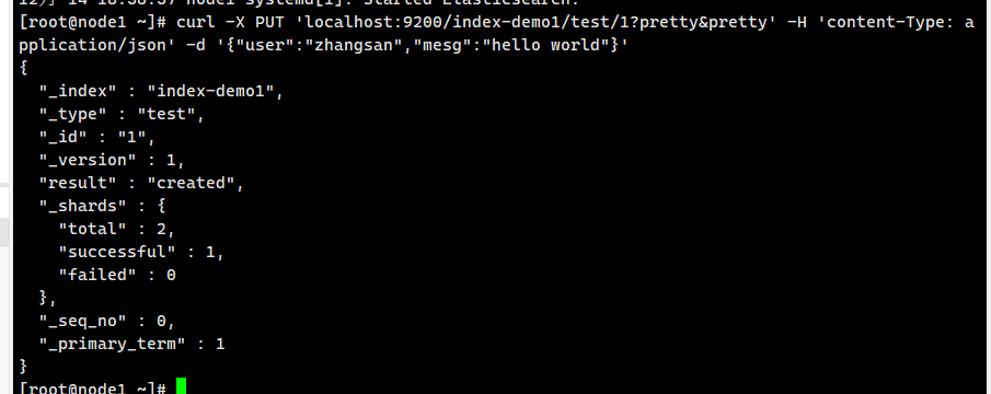命令作用 :向本地 Elasticsearch 服务(端口 9200)的index-demo1索引中,新增 / 更新test类型、ID 为 1 的文档,文档内容为{"user":"zhangsan","msg":"hello world"}。
