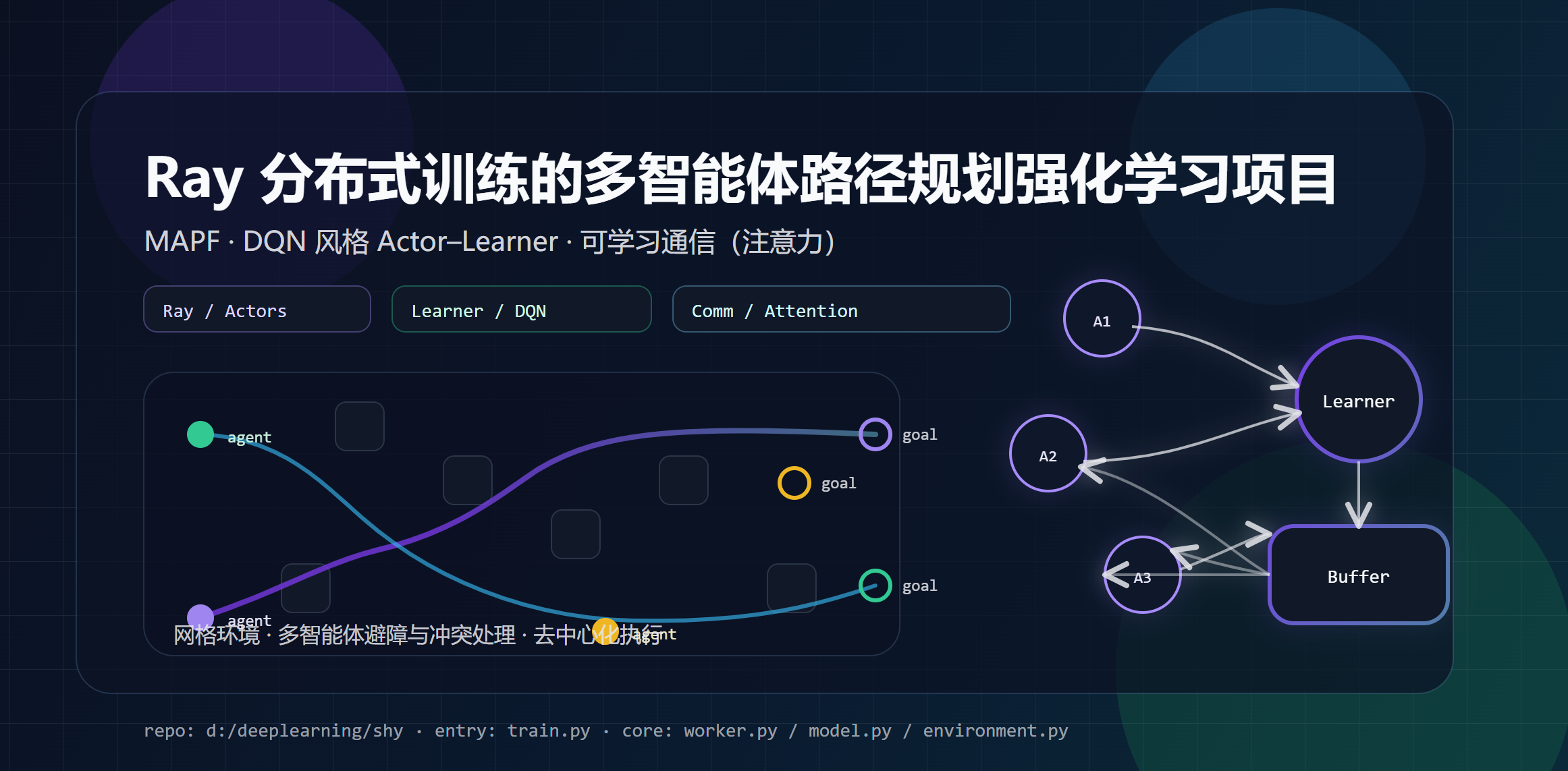 关键词(建议保留):MAPF、多智能体、强化学习、DQN、Ray、Actor-Learner、分布式训练、通信注意力、PyTorch、dtype/AMP。