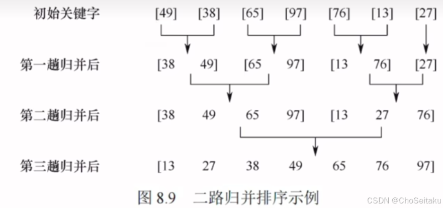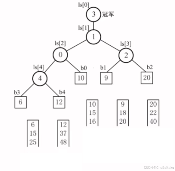 归并多个升(降)序序列:1. 设置多个指针指向每个序列的第一个元素。2. 重复如下步骤直到只剩一个序列未处理完: 将其中较小(或较大)的一方加入到结果序列中,并将对应的指针向后移动一位。3. 将原序列中还未处理完序列的所有元素依次加入结果序列。归并前的序列和归并后的序列升降是相同的。外部排序:∙ 败者树中每个非终端节点表示其左、右孩子节点中的"败者"。∙ 通过冠军选出的关键字在结果序列前面,因此:∙ 如果结果是升序,则冠军选出的是当前最小关键字∙ 如果结果是降序,则冠军选出的是当前最大关键字 \begin{aligned} &\text{归并多个升(降)序序列:} \\ &1. \ \text{设置多个指针指向每个序列的第一个元素。} \\ &2. \ \text{重复如下步骤直到只剩一个序列未处理完: 将其中较小(或较大)的一方加入到结果序列中,并将对应的指针向后移动一位。} \\ &3. \ \text{将原序列中还未处理完序列的所有元素依次加入结果序列。} \\ &\color{orange}\text{归并前的序列和归并后的序列升降是相同的。} \\ \\ &\text{外部排序:} \\ &\bullet \ \text{败者树中每个非终端节点表示其左、右孩子节点中的"败者"。} \\ &\bullet \ \text{通过冠军选出的关键字在结果序列前面,因此:} \\ &\quad \bullet \ \text{如果结果是升序,则冠军选出的是当前最小关键字} \\ &\quad \bullet \ \text{如果结果是降序,则冠军选出的是当前最大关键字} \end{aligned} 归并多个升(降)序序列:1. 设置多个指针指向每个序列的第一个元素。2. 重复如下步骤直到只剩一个序列未处理完: 将其中较小(或较大)的一方加入到结果序列中,并将对应的指针向后移动一位。3. 将原序列中还未处理完序列的所有元素依次加入结果序列。归并前的序列和归并后的序列升降是相同的。外部排序:∙ 败者树中每个非终端节点表示其左、右孩子节点中的"败者"。∙ 通过冠军选出的关键字在结果序列前面,因此:∙ 如果结果是升序,则冠军选出的是当前最小关键字∙ 如果结果是降序,则冠军选出的是当前最大关键字