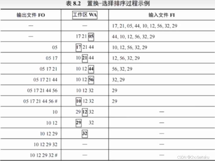 外部排序{① 从外存读入数据进行内部排序得到有序初始归并段优化思路:减少有序初始归并段数量→置换选择排序② 对这些归并段进行逐趟归并优化思路:增大归并趟数而不影响内部归并的比较次数 \begin{aligned} &\text{外部排序} \begin{cases} ① \ \text{从外存读入数据进行内部排序得到有序初始归并段} \\ \quad \text{优化思路:减少有序初始归并段数量} \rightarrow{} \text{置换选择排序} \\ \\ ② \ \text{对这些归并段进行逐趟归并}\\ \quad \text{优化思路:增大归并趟数而不影响内部归并的比较次数} \end{cases} \end{aligned} 外部排序⎩ ⎨ ⎧① 从外存读入数据进行内部排序得到有序初始归并段优化思路:减少有序初始归并段数量→置换选择排序② 对这些归并段进行逐趟归并优化思路:增大归并趟数而不影响内部归并的比较次数